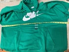 The Nike Men's Sportswear Club Fleece Pullover Hoodie in size XXL is a stylish and comfortable option for men looking for activewear. Made from a blend of polyester and cotton, this green hoodie features a drawstring closure, hooded neckline, and elastic waist for a secure fit. With a logo accent and pouch pocket, it is perfect for various activities such as tennis, hunting, basketball, and weightlifting. This long-sleeve pullover is designed for regular fit, making it suitable for winter, fall, and spring seasons. Easy to care for with machine washable instructions, this hoodie from Nike is a versatile addition to any man's wardrobe. Chest 58x28”. 6624