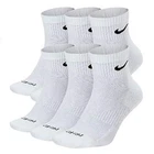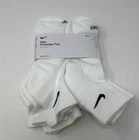 New Nike Men's Everyday Performance Plus ANKLE Socks 6 Pack in White, size Large (8-12). These socks are made of polyester, nylon, and cotton materials, featuring cushioned soles for comfort. They are designed for regular size and have a Dri-Fit technology for moisture management. The pack includes 6 pairs and the socks are ankle length. Made in Pakistan.
