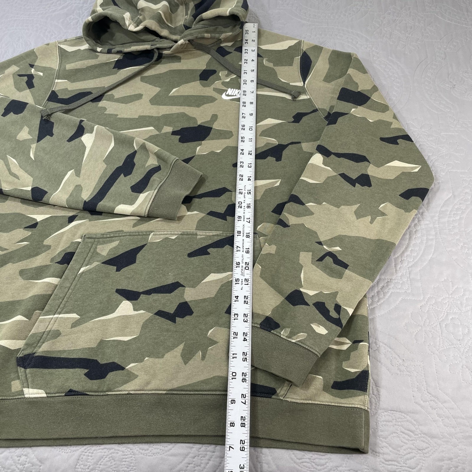 Nike Hoodie Mens Large Green Camo Pullover Fleece Swoosh Logo Sweatshirt Condition: Gently worn, no visible flaws. No stains, holes, or major signs of wear noted in photos. Features an allover green, beige & black camouflage print with Nike Swoosh logo embroidered in white on left chest Classic pullover design with drawstring hood and front kangaroo pocket Material: Cozy fleece interior; shell tag not shown, but typical for this style is a cotton/poly blend Tag Size: Large (Mens) Flat measurements (approximate): Pit to pit 24", length 29", sleeve from collar 31" Made in Cambodia Style great for streetwear, loungewear, or athletic use