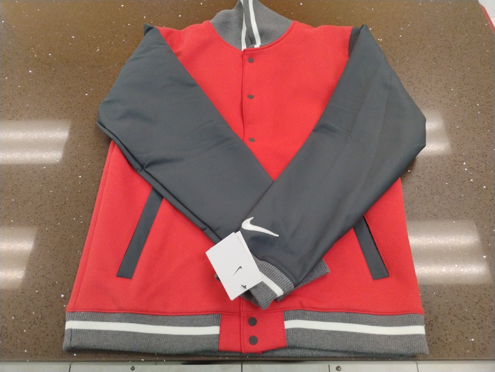 The Nike Men's Size Medium Team Orange Letterman Jacket is a stylish and versatile outerwear option perfect for various activities. Made from a durable polyester blend, this mid-length jacket features a classic colorblock pattern with a snap closure and a varsity jacket style. The breathable lining and insulation make it suitable for all seasons, while the retro theme adds a nostalgic touch. Whether you're hitting the football field, walking to school, or just looking to add a pop of color to your wardrobe, this limited edition Nike jacket is a must-have.