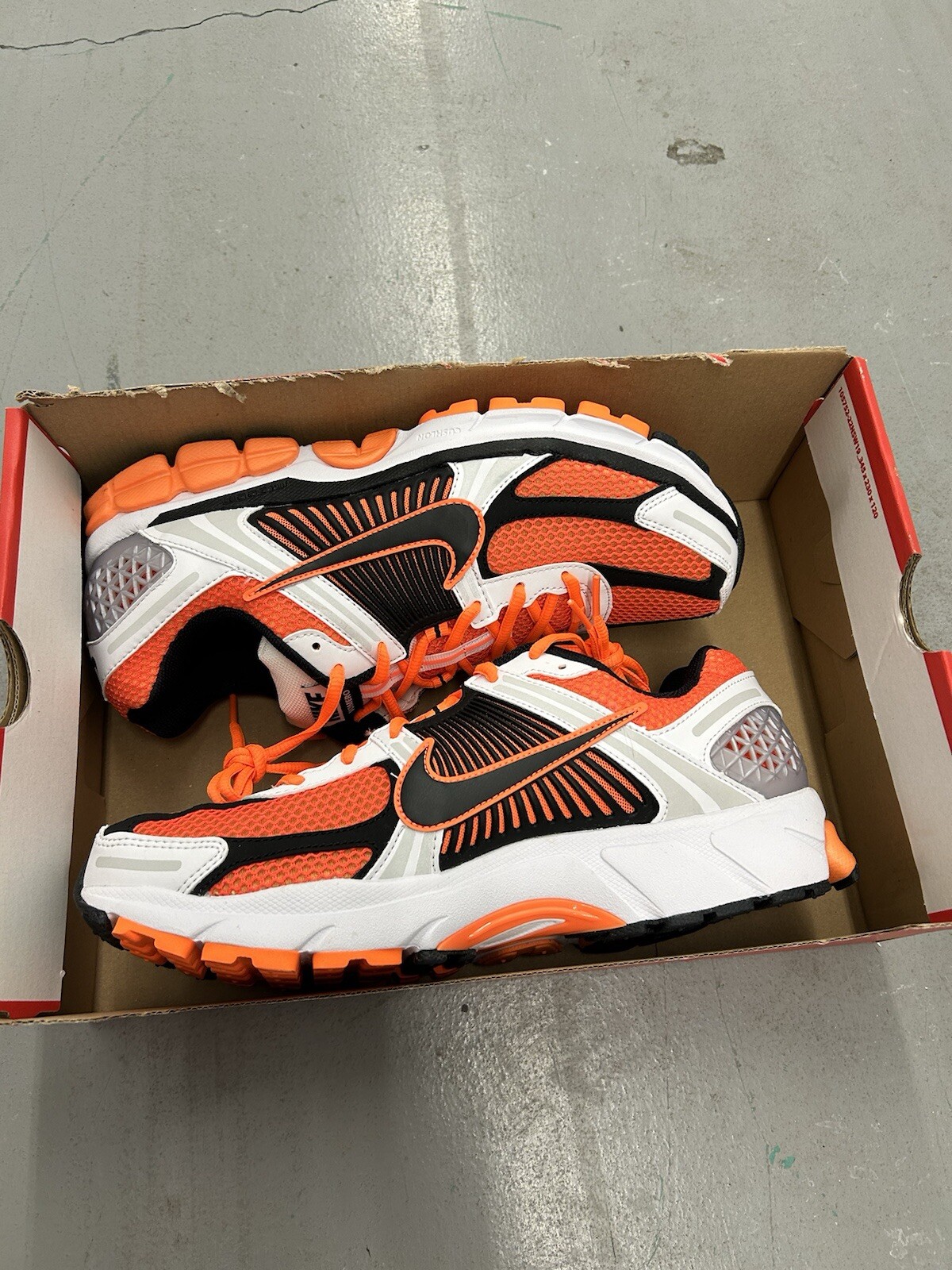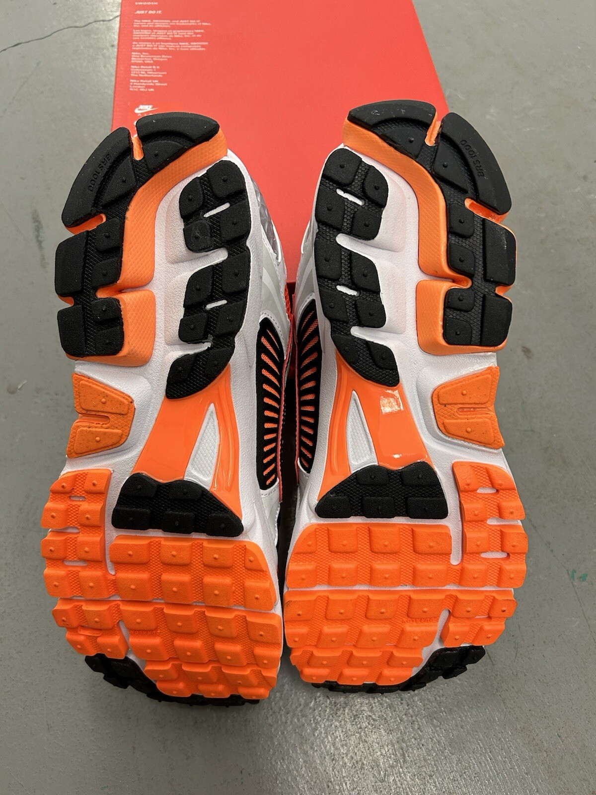 The Nike Men's Zoom Vomero 5 in Orange, Black, and White is a vibrant and comfortable sneaker featuring a lace-up closure and a low-top shoe shaft style. This athletic shoe is designed for walking, running, jogging, and everyday wear, with a standard shoe width and a rubber outsole for traction. The colorblock design and colorful theme make it stand out, while the leather upper and fabric lining provide durability and breathability. Perfect for all seasons, this Nike Zoom Vomero model offers both style and performance for men in size 11. Please note box top has been ripped off. Shoes are brand new and never worn