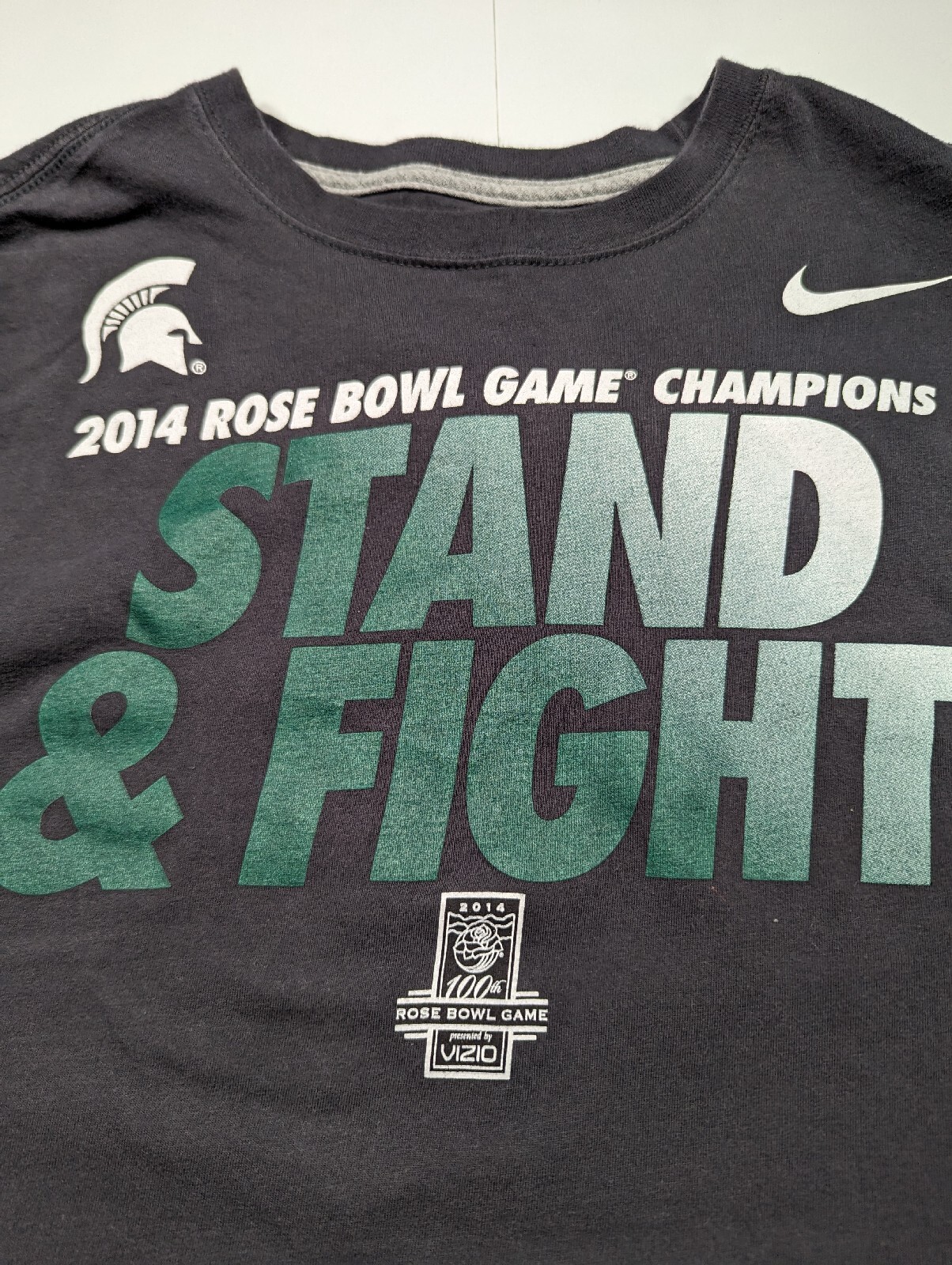 This long sleeve shirt is in excellent condition. It has been cleaned and is ready to wear. This shirt does not have any stains or holes. The measurements are included in the pictures. Show off your love for Michigan State Spartans with this Nike Men's size XXL gray long sleeve T-shirt. Celebrate the Rose Bowl Champions while wearing this comfortable shirt with a round neck and regular fit. The solid pattern shirt features a sports logo graphic print and is made in Honduras. Represent the Spartans in style with this pre-owned shirt that is in excellent condition. The vintage shirt is perfect for any Michigan State fan, and the size type is regular. This T-shirt is an excellent addition to any wardrobe, and it's great for any casual occasion.