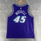 The product is a Nike NBA Retro Jersey for the Utah Jazz featuring player Donovan Mitchell's #45. This men's jersey is in size 2XL and comes in a purple colorway. It is officially licensed by the National Basketball Association (NBA) and designed for fans of the Utah Jazz or Donovan Mitchell to show their support in style. Perfect for wearing during the regular NBA season, this jersey combines retro design elements with modern Nike technology for both comfort and performance on and off the basketball court.