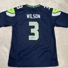 Show off your love for the Seattle Seahawks with this officially licensed Russell Wilson Nike NFL On-Field jersey. The blue color and #3 make it clear which team and player you support. This jersey is perfect for young boys who are fans of the National Football League and want to show their team spirit during the regular season. The size L is perfect for boys who want a comfortable fit while wearing their favorite player's jersey. The Nike brand ensures high quality and durability that will last even with frequent wear. Get ready to cheer on the Seahawks with this stylish and sporty jersey.