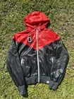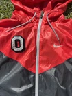 This is a Nike Ohio State Buckeyes men's jacket in size large, designed for football fans. It is an officially licensed red full zip hoodie with Dri-Fit technology, suitable for the regular season. Perfect for staying comfortable and stylish while supporting the Ohio State Buckeyes team. Item is in used condition and has wear on it as seen on the logos in the photos.