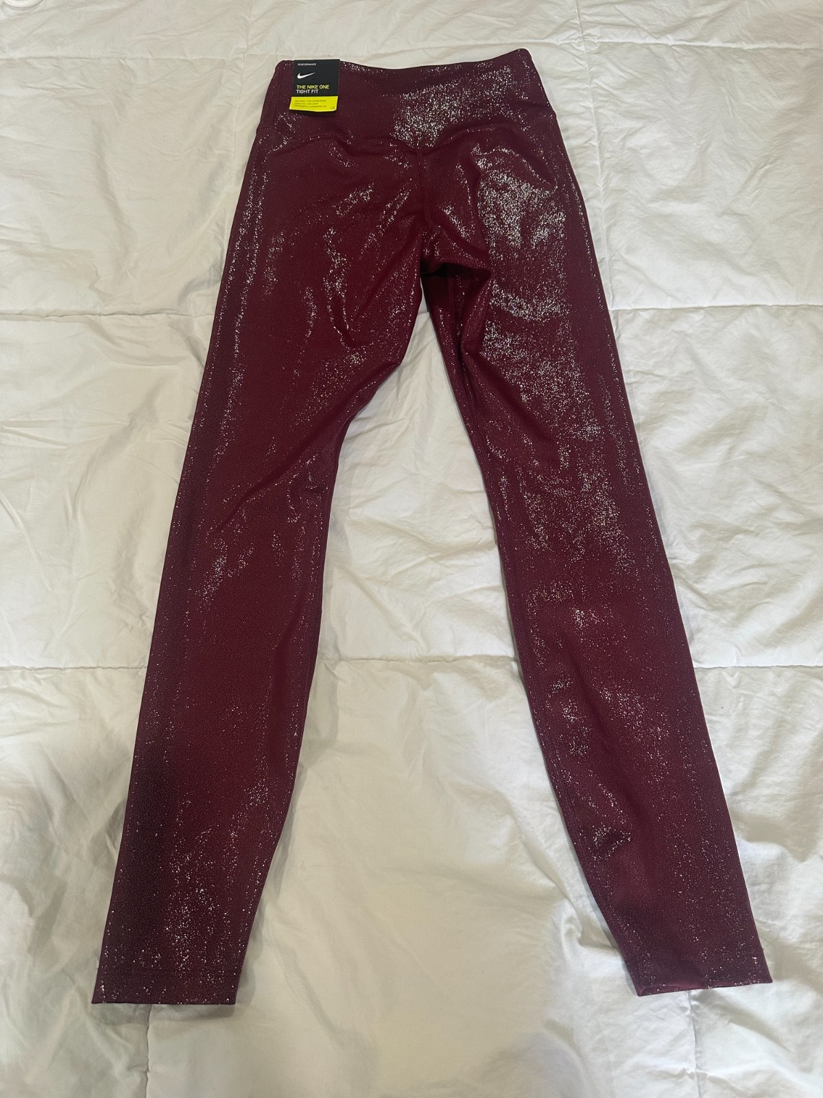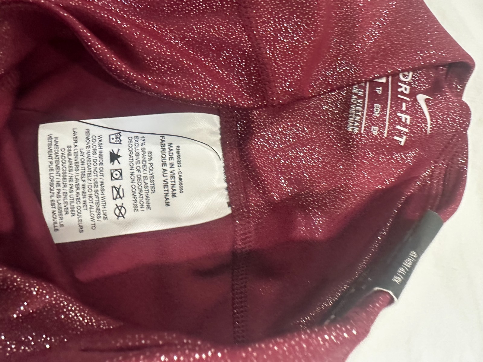 Crush your workout and your style goals in these stunning Nike tight-fit maroon leggings with a subtle glitter finish. Designed to move with you, they offer a sleek silhouette, moisture-wicking fabric, and just the right amount of sparkle to stand out at the gym or on the go. 💪 Bold fit. Fierce shine. All Nike.