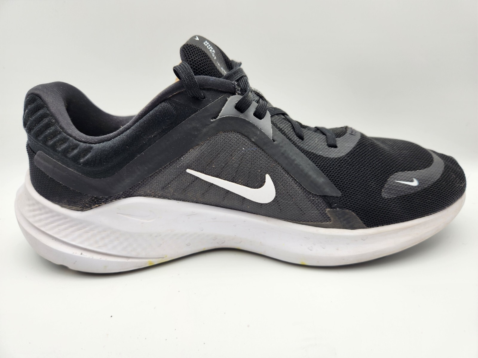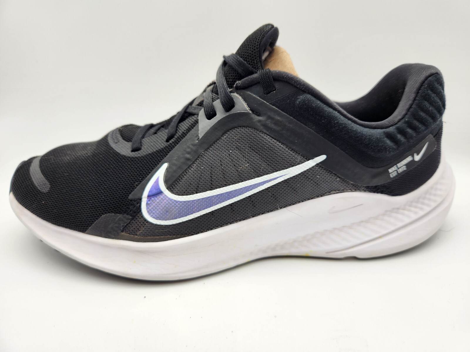 The Nike Quest 5 Road Running Sneakers Shoes in Black and White with Lavender Swush are designed for women in size 8.5 (UK size 6). These lace-up sneakers feature a comfortable and breathable design suitable for various activities like gym training, walking, and running. The lightweight construction and Nike logo accents make them a versatile choice for activewear, casual outings, and workwear. With a colorful theme and style, these athletic shoes are perfect for the spring, summer, and fall seasons, offering both fashion and performance for the modern woman on the go. Thanks for looking. A8