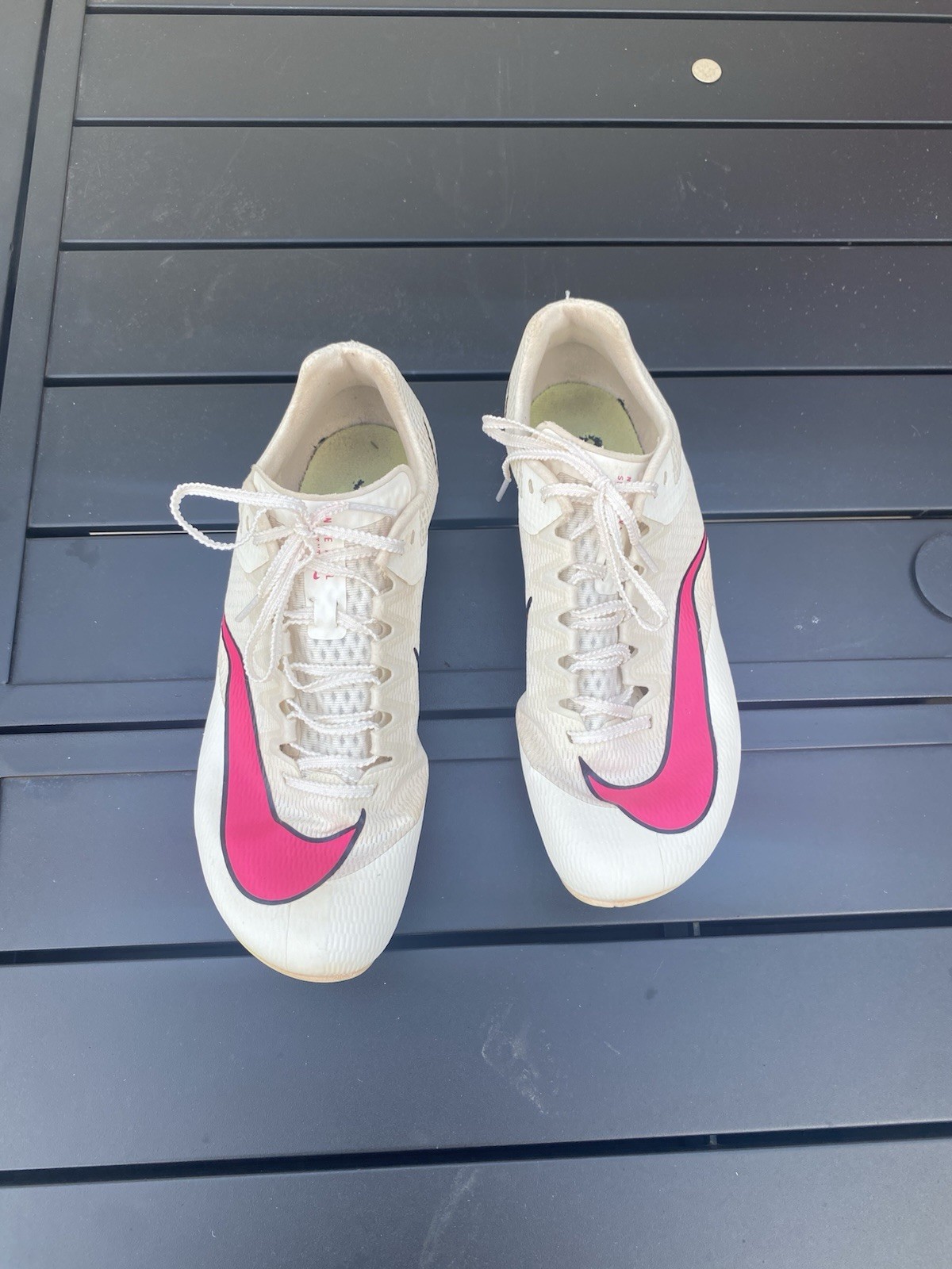 The Nike Rival Sprint Track Field Sprinting Spikes in pink and white are designed for athletes looking to enhance their performance on the field. These were worn for 1 season. Comes with show bag, 2 replacement spikes, and spike replacement tool. Some dirt stains pictured on the sides of the shoes!