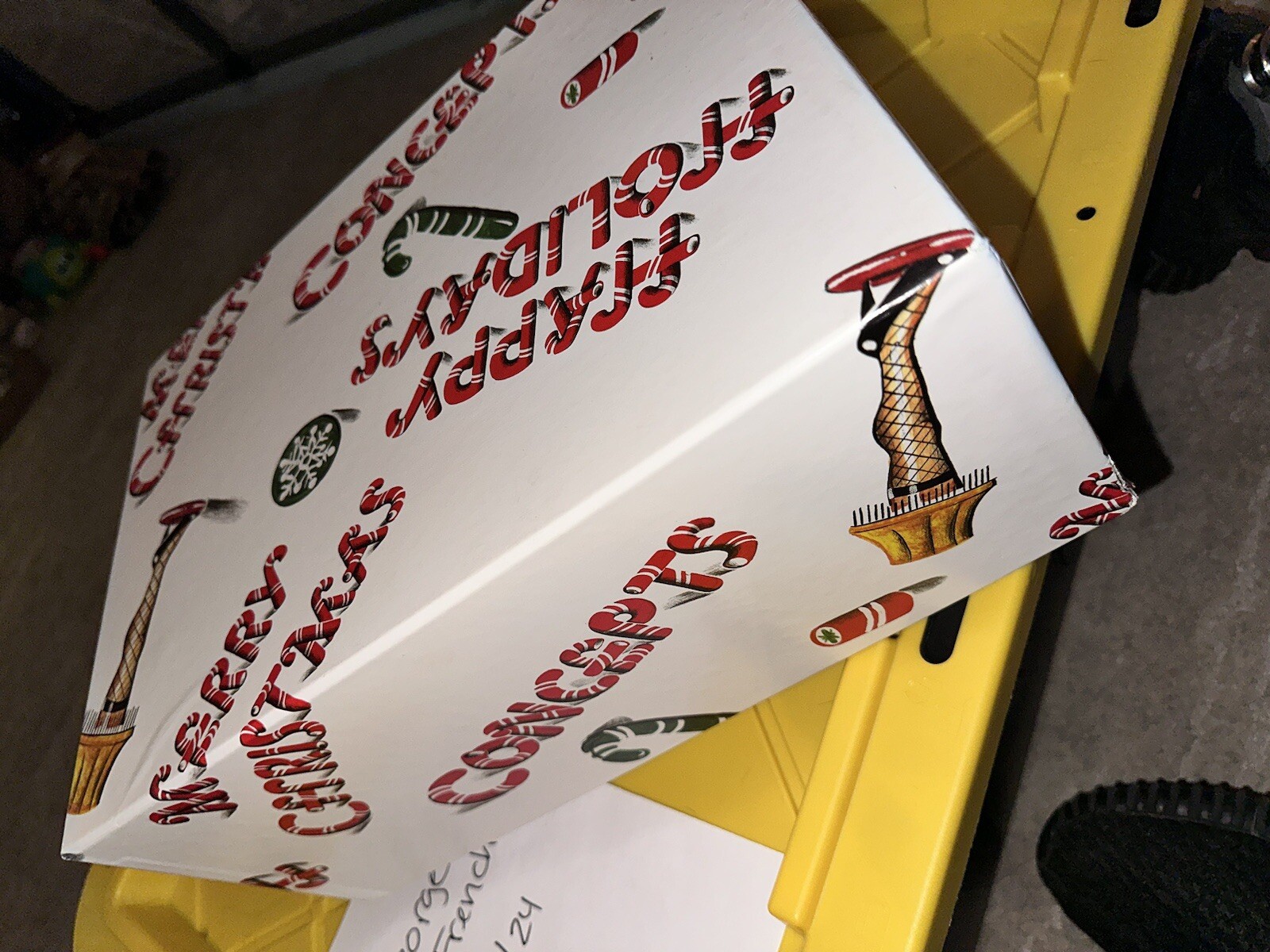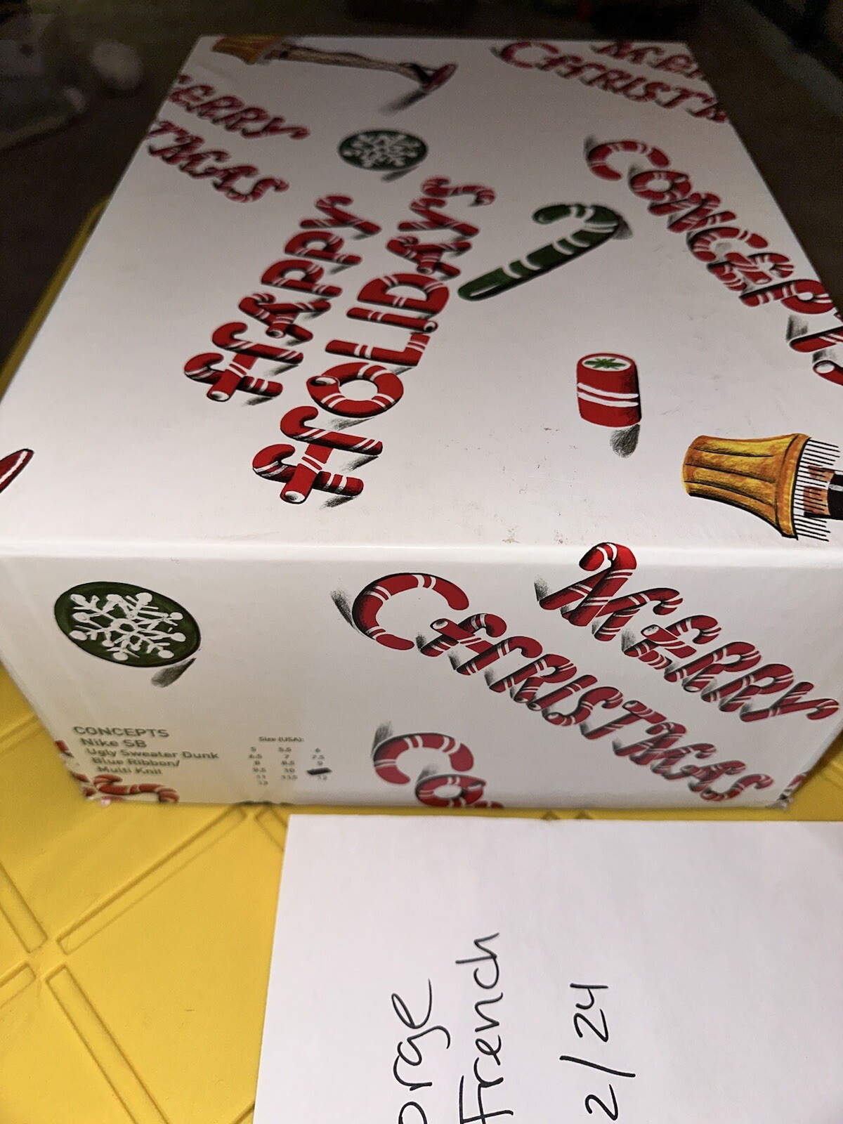 This Nike SB Dunk High x Concepts sneaker in size 10.5 features a unique "Ugly Christmas Sweater" design with a multicolor palette. The special box adds to the appeal of this limited edition collaboration. Perfect for those looking to add a festive and standout piece to their sneaker collection. Box and advent calendar are in virtually perfect condition with all of the extra laces still attached to the shoes.