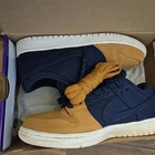 Stain on right toe Elevate your sneaker game with these Nike SB Dunk Low PRM 90s Backpack Desert Ochre Midnight Navy (Men's) DX6775-400 athletic shoes. Designed with a low top shoe shaft style, these sneakers feature a stylish blue color and a comfortable fit perfect for everyday wear. The shoes are made with high-quality materials and have a durable construction that will last for years to come. With a UK shoe size of 8 and a US shoe size of 9, these sneakers are perfect for men who love Nike products. The shoes are part of the Nike SB product line and have a 90s theme that adds a touch of nostalgia to your outfit. Whether you're a sneaker enthusiast or an athlete, these Nike SB Dunk sneakers are a must-have in your shoe collection.