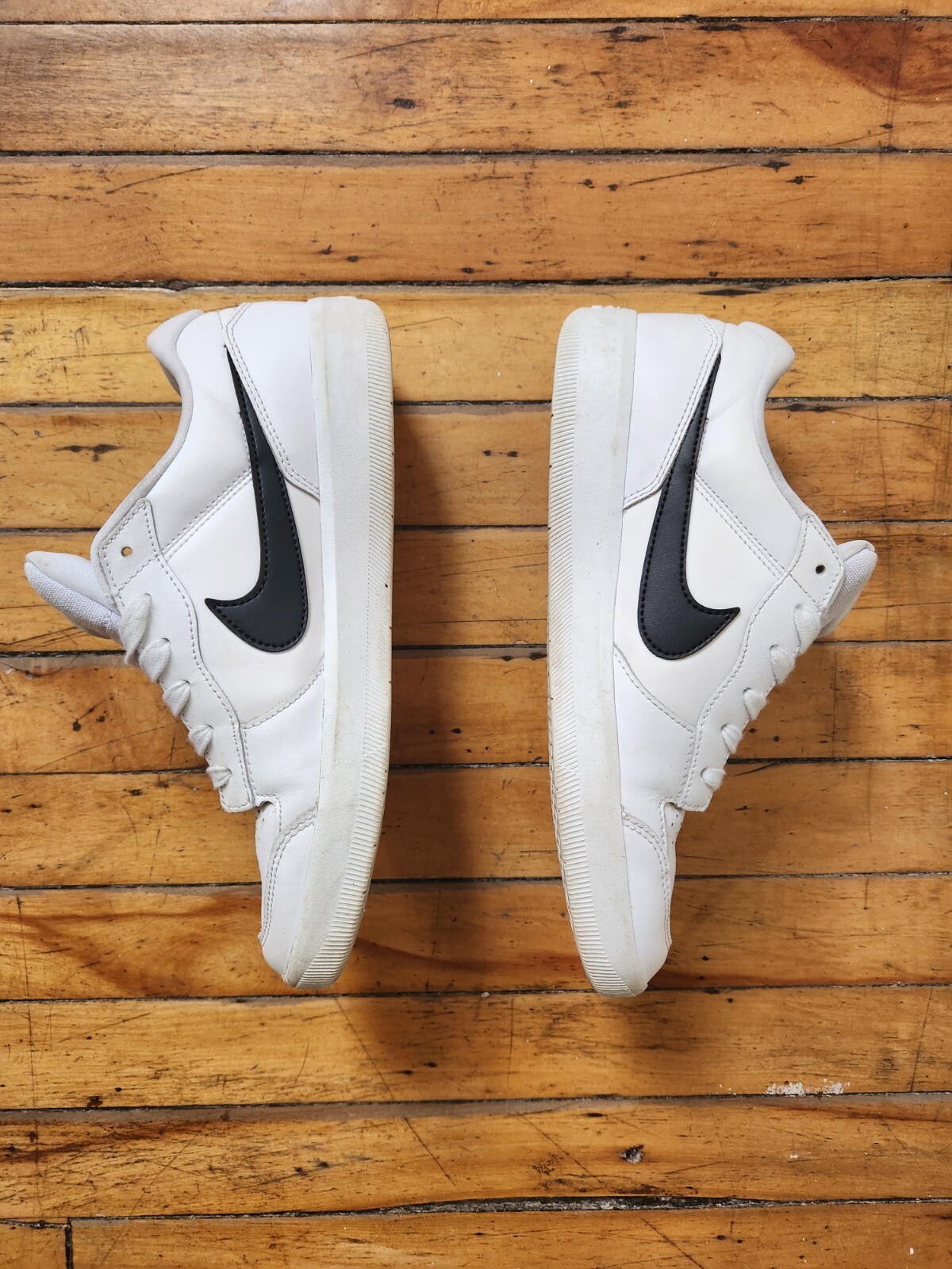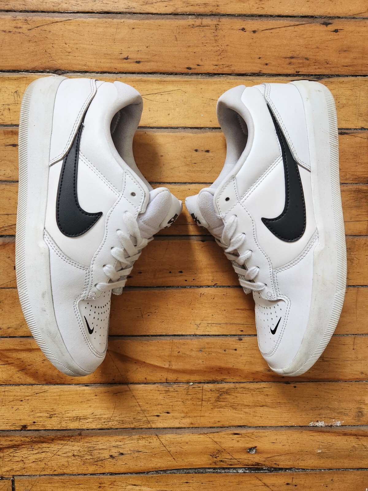 The Nike SB Force 58 Premium gives you the durability of a cupsole with the flexibility of a vulcanised shoe. Made from soft, supple leather and finished with perforations, the whole look is infused with heritage basketball DNA. Color: White/White/White/Black Style: DH7505-101 Country/Region of Origin: Vietnam Sneakers were purchased in 2022 from Nike and used lightly in the summer. Original laces. Exterior cleaned. No box included. Defects: minor creasing in the front, wear on the bottom heel, minor scuffing and discoloration on soles No refunds