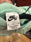 This Nike SB hoodie sweatshirt in mint green is a men's size XL. Made of a cotton/polyester blend, it features a hood, pullover style, and genuine trademark logos. This heavyweight hoodie has pockets, a relaxed fit, and is suitable for winter, fall, and spring seasons. Ideal for various activities like golf, soccer, and basketball, this comfortable and athleisure-themed hoodie is a stylish addition to any wardrobe.