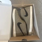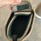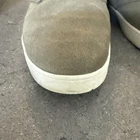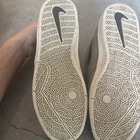 Used shoes. Black line on front toe of one shoe. White sole has some coloring. Treads in good condition. Some small dirt in gaps.