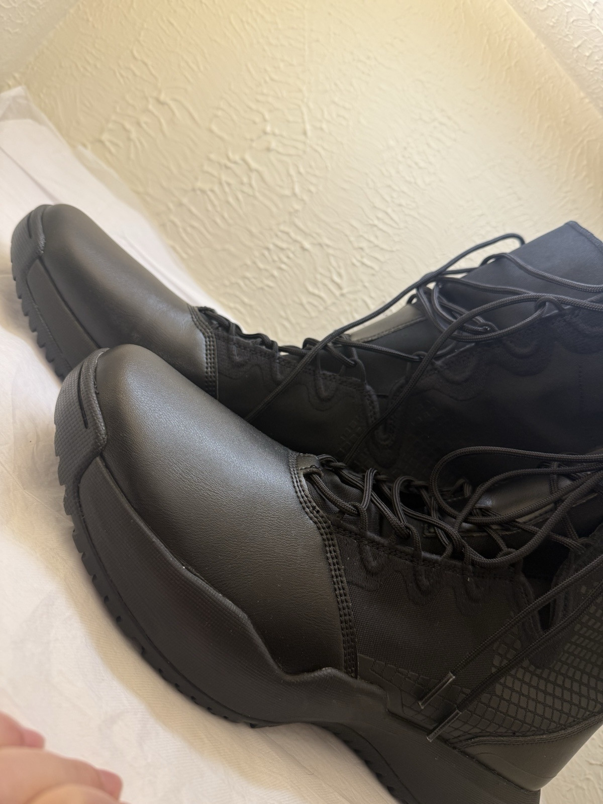 Nike SFB B2 Men's size 15 'Triple Black' Tactical Outdoor Boots are versatile combat boots featuring lace-up closure, mid-calf shaft style, cushioned insole, lightweight construction, and breathable synthetic upper material. Ideal for activewear, workwear, or casual wear, these boots offer comfort and support with a rubber outsole. Perfect for tactical, military, or athleisure styling in all seasons. Brand: Nike. Model: SFB B2.