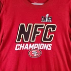 Official Nike NFL San Francisco 49ers NFC Champions long sleeve t-shirt. Features Super Bowl logo patch and team graphics on front. Red cotton blend material in excellent condition. Nike swoosh logo on sleeve. Perfect for any 49ers fan. Color: Red Department: Men Type: T-Shirt Fit: Regular Sleeve Length: Long Sleeve Character: 49ers Mascot, Sourdough Sam, NFL Player, Football Star, Team Mascot Pattern: Graphic Print Character Family: NFL Teams, San Francisco 49ers, Super Bowl Teams, NFC Champions, Professional Football Keywords: 49ers, NFL, Super Bowl, NFC Champions, long sleeve, athletic wear, football, sports apparel, team merchandise, Nike NFL, San Francisco all items have been cleaned and disinfected we stand behind all we sell so please contact us if you have an issue with any order