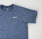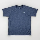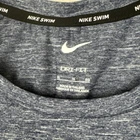 This Nike Swim T-shirt in size XL is a solid blue shirt with a crew neck and short sleeves. Made of polyester with Dri-FIT technology, it offers UV protection with UPF 40 rating. The shirt features the Nike logo and is designed for a regular fit. Ideal for outdoor activities, the shirt is perfect for the beach or sports activities. Made in Malaysia as part of the Nike Dri-FIT product line.