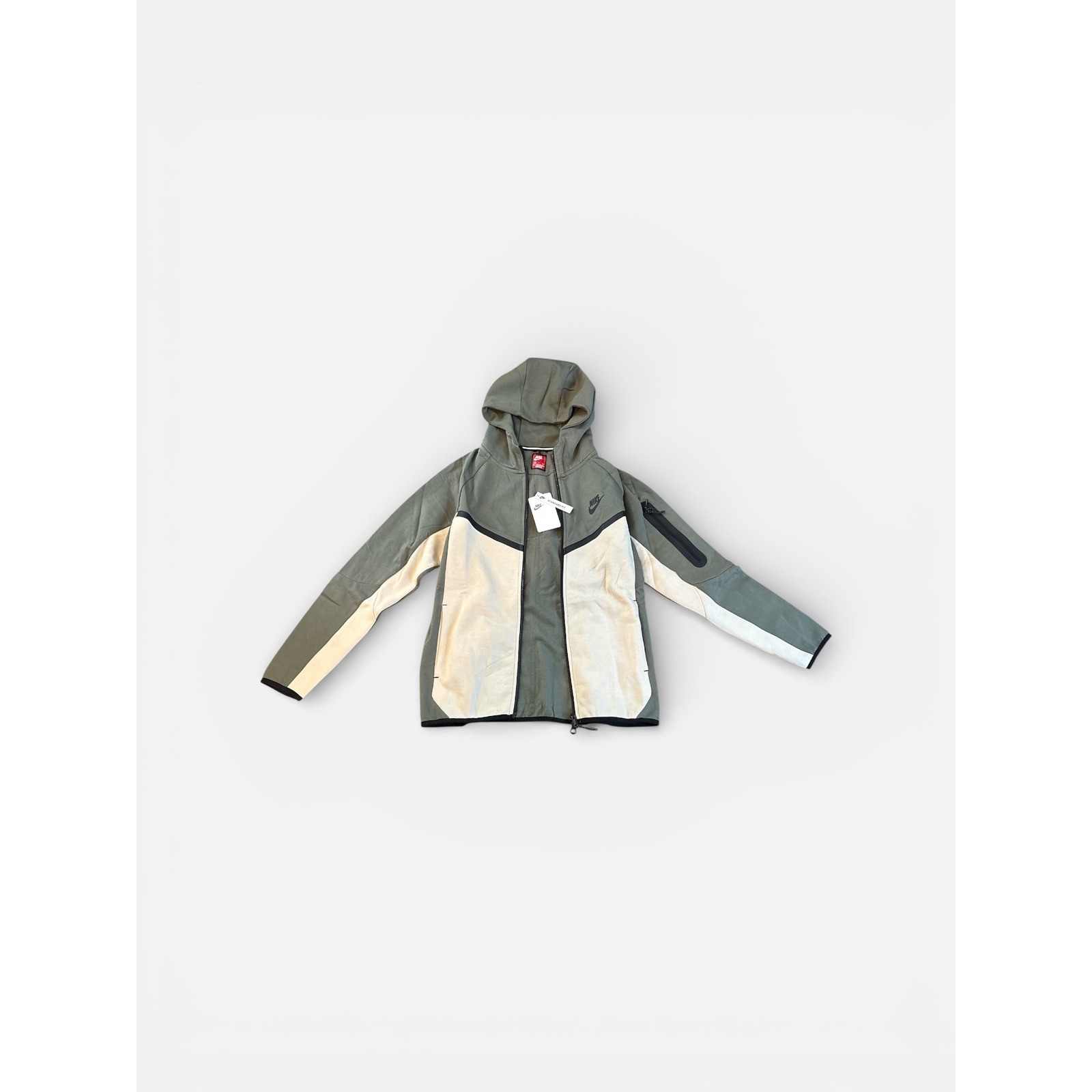 Nike Tech Fleece tracksuit full set in a two-tone olive green and cream colorway offers a modern athletic aesthetic with premium lightweight warmth. The full-zip hoodie features a high neck, chevron chest design, and a zippered sleeve pocket, while the matching joggers include an elastic waistband with drawstrings and tapered cuffs for a streamlined fit. Signature Nike Futura logos appear on both pieces, making this a versatile choice for streetwear or active recovery.