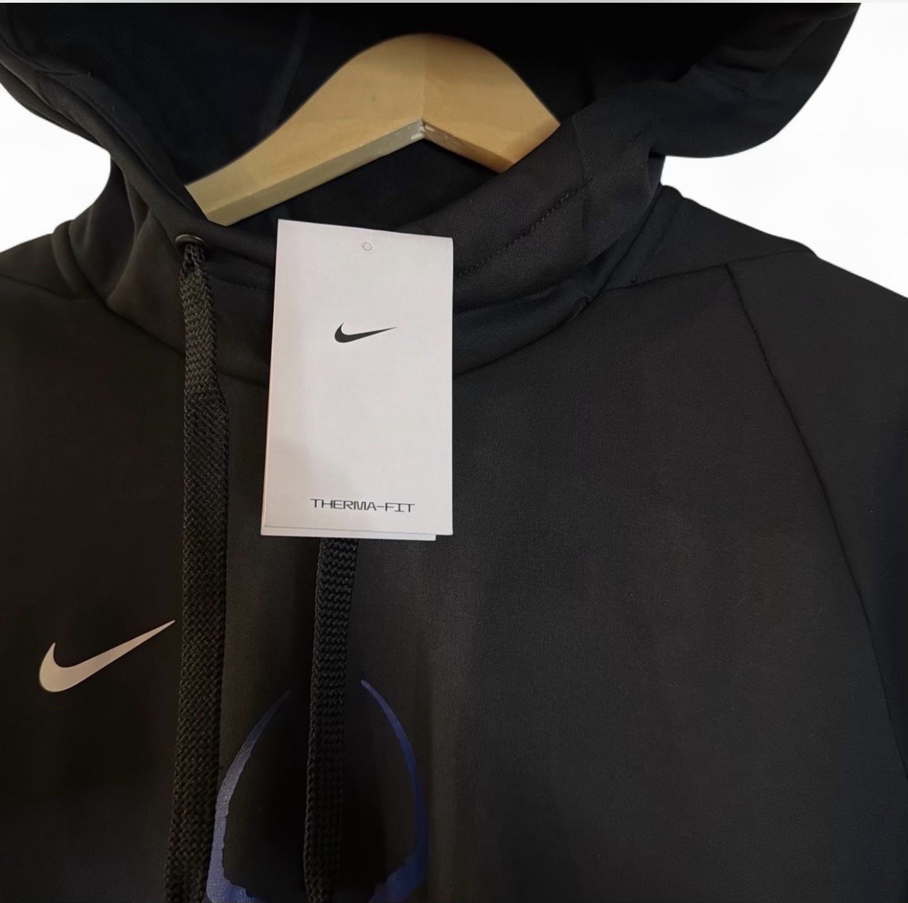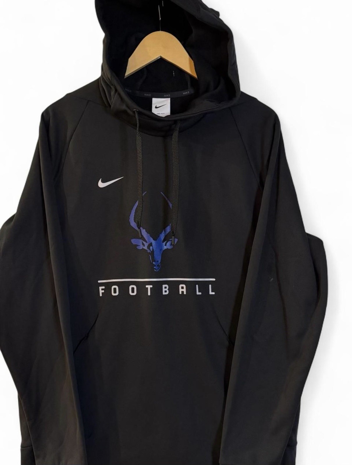 The Nike Therma Fit Kobe Bryant Hoodie Sweatshirt in football size L is a vintage style pullover featuring a drawstring closure, crew neck, and fleece fabric type. The hoodie showcases a graphic print logo accent, making it a stylish choice for men who enjoy outdoor sports activities like basketball, football, and running. Made from a combination of polyester and spandex, this heavyweight hoodie is suitable for all seasons and includes pockets for added functionality. With its classic black color and Nike Elite product line, this hoodie is a must-have for those looking for a comfortable and on-trend activewear piece.