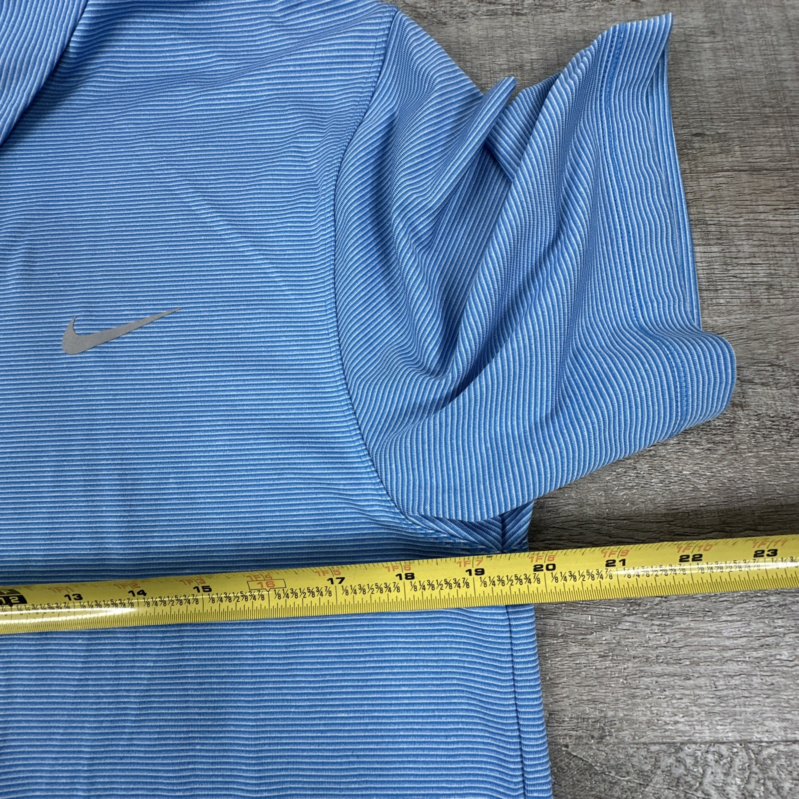 The Nike Tiger Woods Collection Men's Size S Blue Striped Dri-FIT Golf Polo Shirt is a stylish and functional piece of clothing designed specifically for golf enthusiasts. Made with a blended fabric that includes polyester, this polo shirt offers breathability and comfort during outdoor activities. The blue striped pattern and logo accents add a touch of sporty style, perfect for both casual wear and golfing in the warmer seasons. With a spread collar and button closure, this polo shirt provides a classic and clean look that is sure to impress both on and off the golf course.