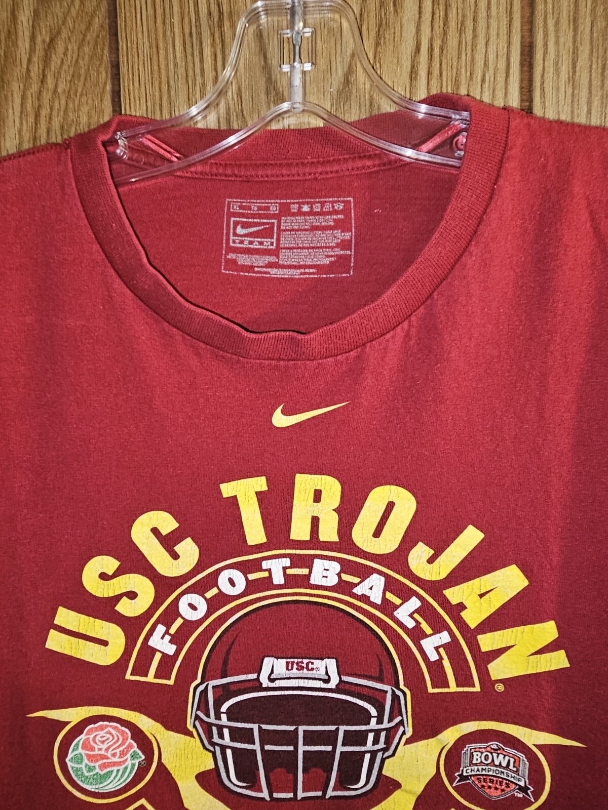 Some cracking on graphic see pictures for details This is a Nike University Southern California 2009 Rose Bowl XL men's red graphic logo tee. It is officially licensed fan apparel featuring the USC Trojans football team. The shirt is designed for pre & post-season wear, specifically for bowl games. It is in size XL and made for male fans who support the team.