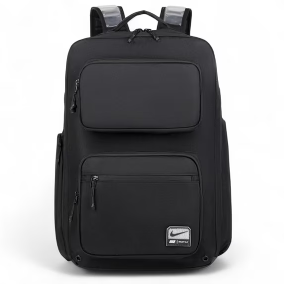 Crafted with 100% polyester and a PU coating for exceptional durability Made with at least 65% recycled materials, promoting sustainability Features a two-way zip main compartment with an interior zip pocket for organized storage Includes a secure zip laptop compartment that fits up to a 16-inch laptop Offers a side zip pocket and a side zip mesh water bottle pocket for added convenience Equipped with front exterior zip pockets for quick access to essentials Adjustable padded shoulder straps provide comfortable carrying Includes a back luggage pass-through strap for easy travel Showcases a contrast welded Swoosh logo for a stylish touch Dimensions: 18" H x 11" W x 6" D, with a capacity of 1648 cubic inches / 27" L