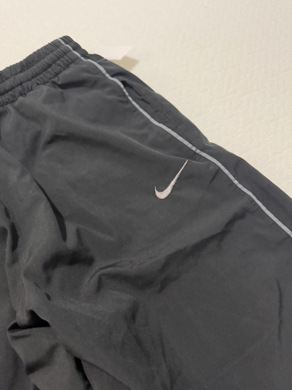 Nike Vintage Parachute Y2K Nylon Baggy Pants in size Medium are black track pants with an oversized fit. Made of polyester, these pants feature a retro 90s style with a Nike logo. Designed for gym & training or dance, they offer a comfortable and sporty look for men.