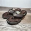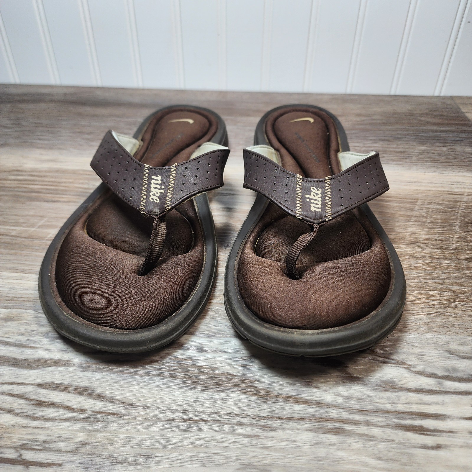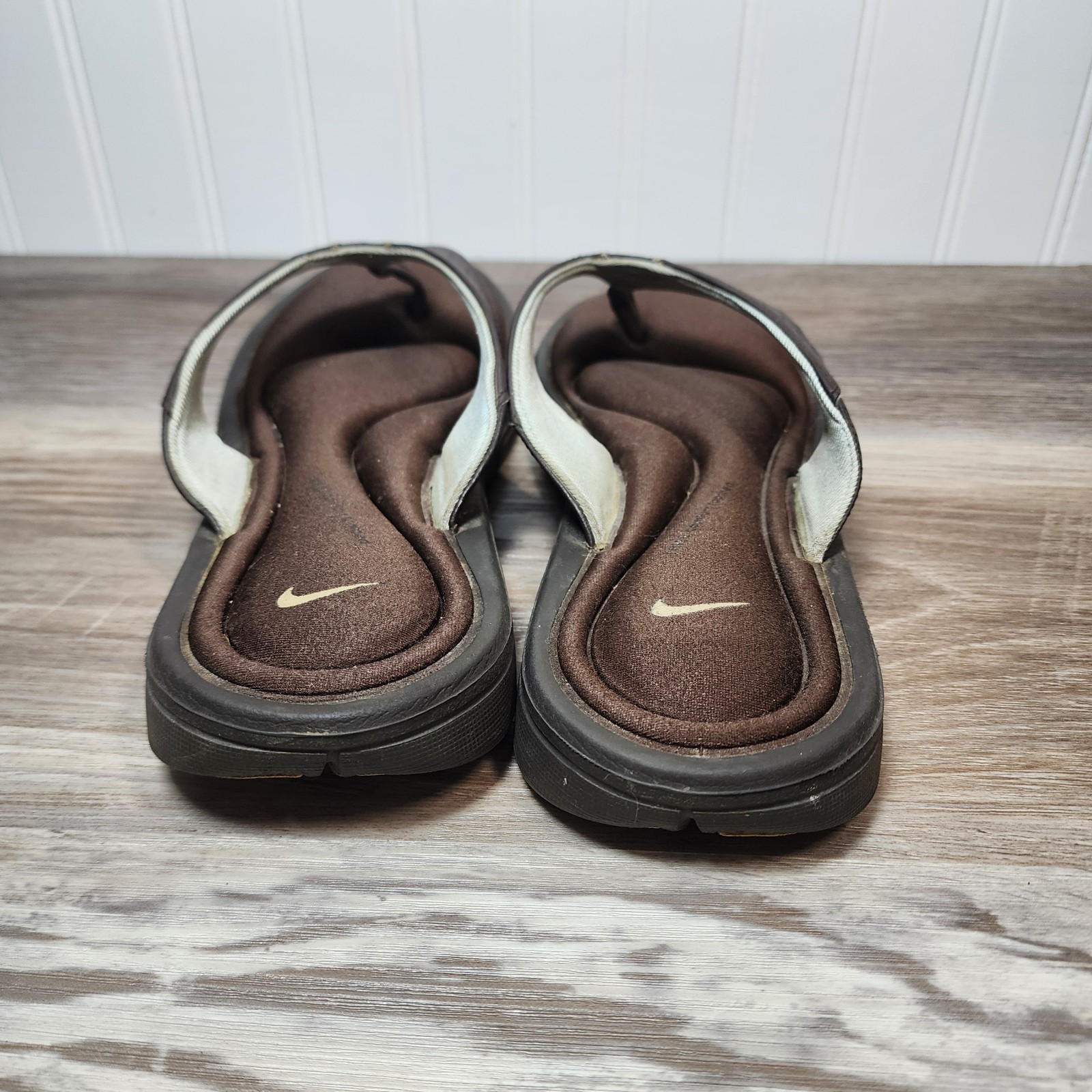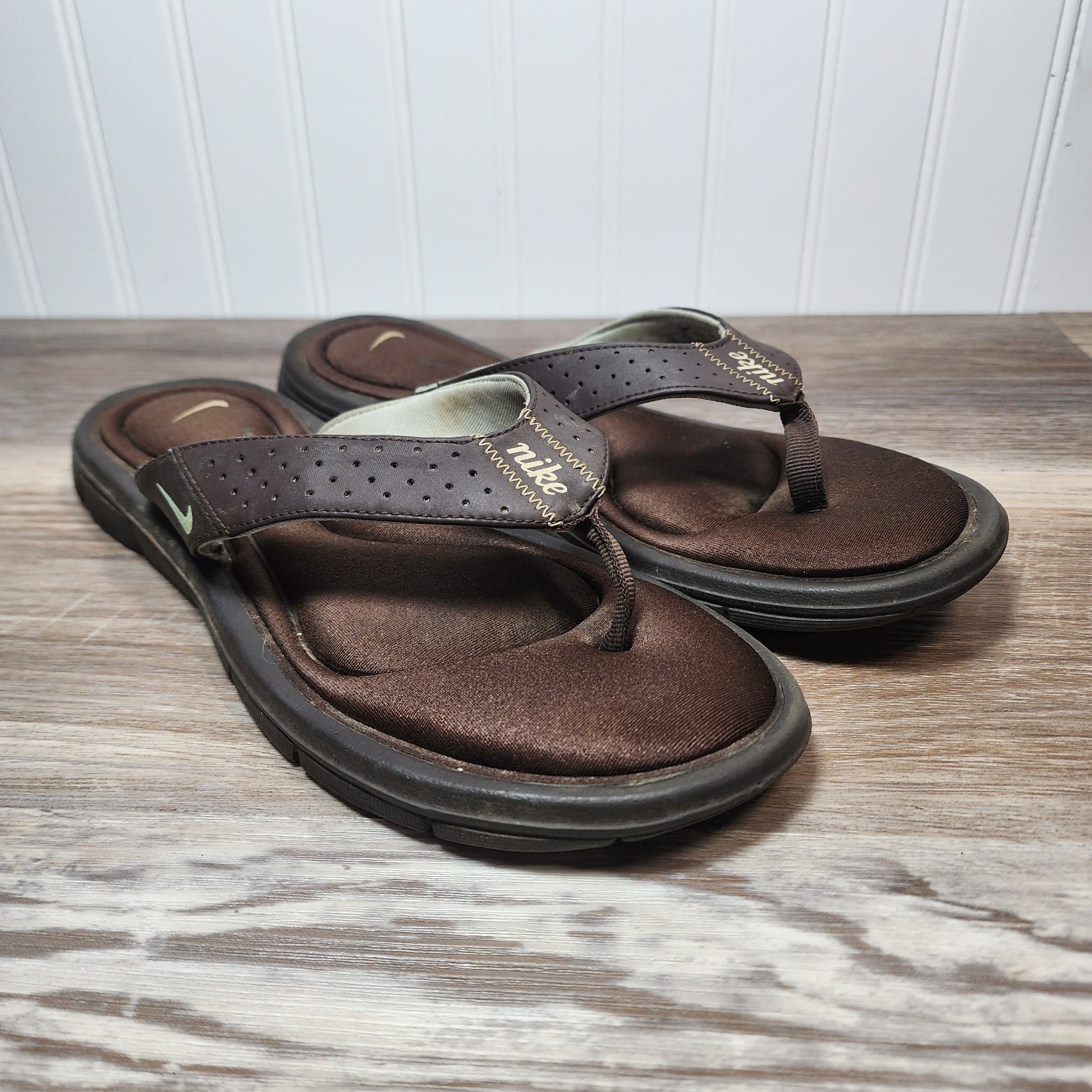 The Nike Comfort Footbed Brown Light Blue Flip Flop Sandals in size 7 are perfect for women looking for a comfortable and stylish footwear option. These sandals feature a slip-on closure, a flat heel, and a cushioned insole for added comfort. The brown color with light blue accents and Nike logo detail make these sandals a versatile choice for casual or travel occasions during the summer, fall, or spring seasons. Made with a rubber outsole and synthetic upper, these sandals are designed to provide both durability and a relaxed fit for loungewear, beach outings, or outdoor activities.