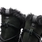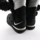 This Nike Women's Winter High snow boot is a vintage-inspired mid-calf boot designed for outdoor activities in winter. Made of black suede with faux fur lining, it features a round toe, lace-up poms, and a zip closure for easy wear. The low wedge heel and rubber outsole provide comfort and traction, while the insulated and water-resistant properties make it suitable for cold weather. With a classic and retro theme, this boot is a stylish choice for activewear and outdoor adventures. Perfect for a size 6 US shoe size and a UK size 3.5.