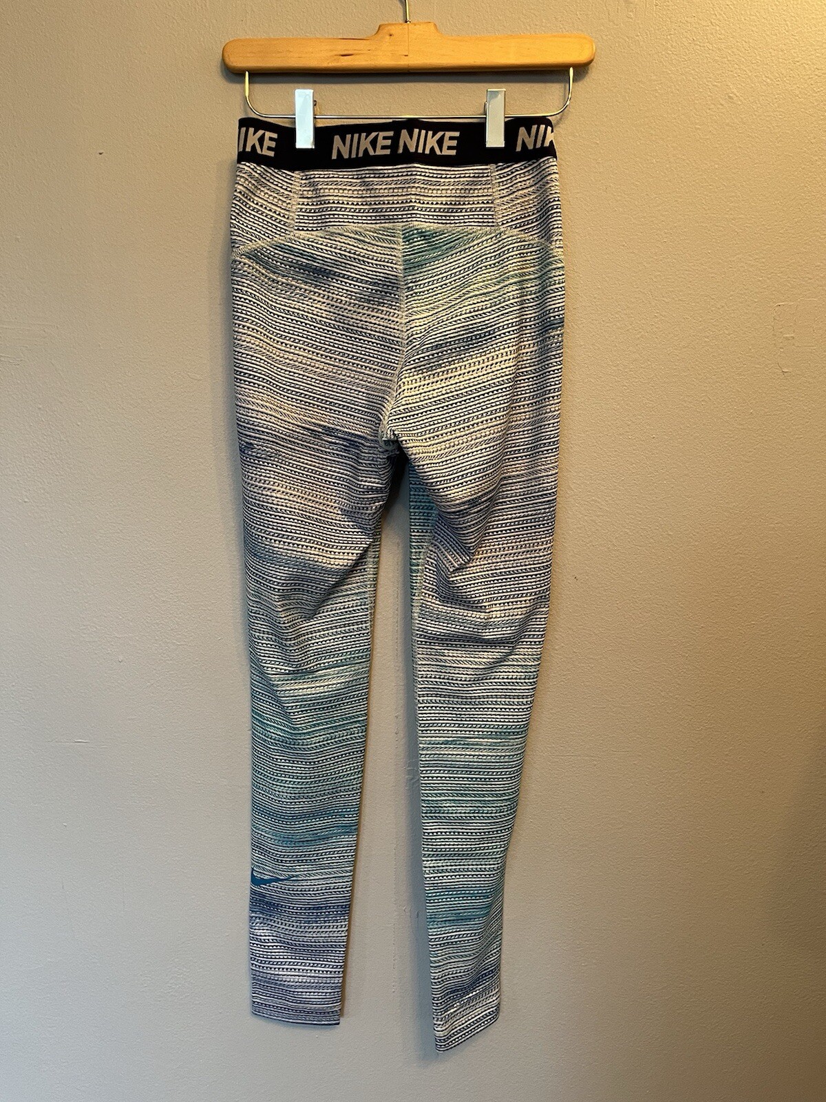 Nike Women’s Size Small Dri-Fit Athletic Workout Leggings Stretch Blue & White Pattern. Leggings are in excellent pre-owned condition.