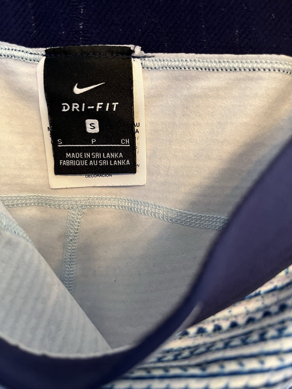 These leggings are super comfy and fit perfectly! The Dri-Fit material keeps me cool during workouts, and the blue and white pattern is stylish. They’re in great condition—barely look used. Love them!
