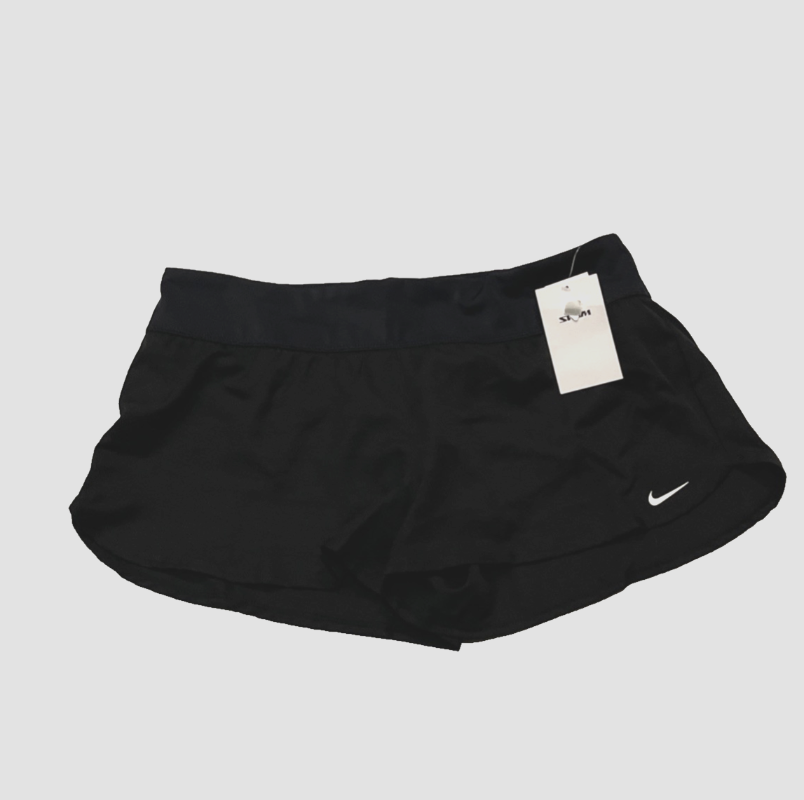 Nike women's Element Swim Board Shorts size: Large color: Black Pull-on style Wide waistband Modern Athletic Fit Sits at hips Full bottom coverage Swoosh logo and slits at side hem Unlined Chlorine resistant Zipper pocket detail on back waistband Polyester K29