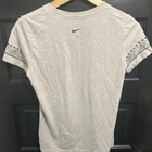 This Nike Women's T-Shirt is perfect for any active occasion. The Dri-Fit technology ensures you stay comfortable and dry, while the gray color with logo on sleeves adds a touch of style. Available in size S, this regular fit shirt is ideal for activewear. The shirt is part of the Clothing, Shoes & Accessories, Women, Women's Clothing, Activewear, and Activewear Tops categories. Add it to your wardrobe and enjoy the quality and comfort of Nike.