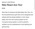 Nike Women’s React Ace Tour Golf Shoes. Standard Fit Every detail, from the new traction pattern to the innovative lacing system, is built to perform A shallower toe box, a tapered heel, a higher arch and an outsole that narrows through the arch Cushioned Responsiveness Lightweight, durable foam sockliner that delivers a smooth, springy ride Traction along the perimeter of the shoe Mudguard wraps the entire shoe, adding durability to high-wear areas Any size between 6-10 Message me the size you need.