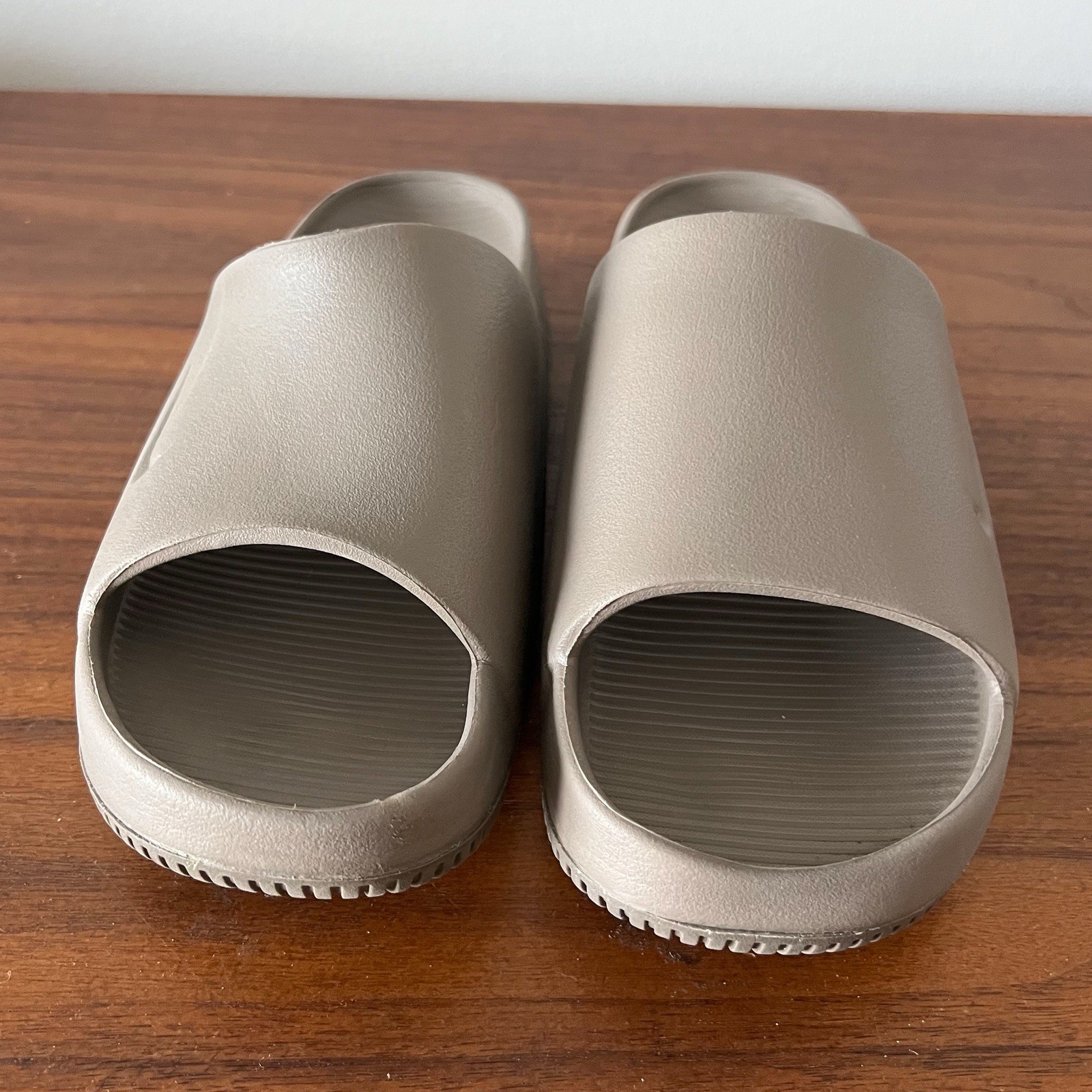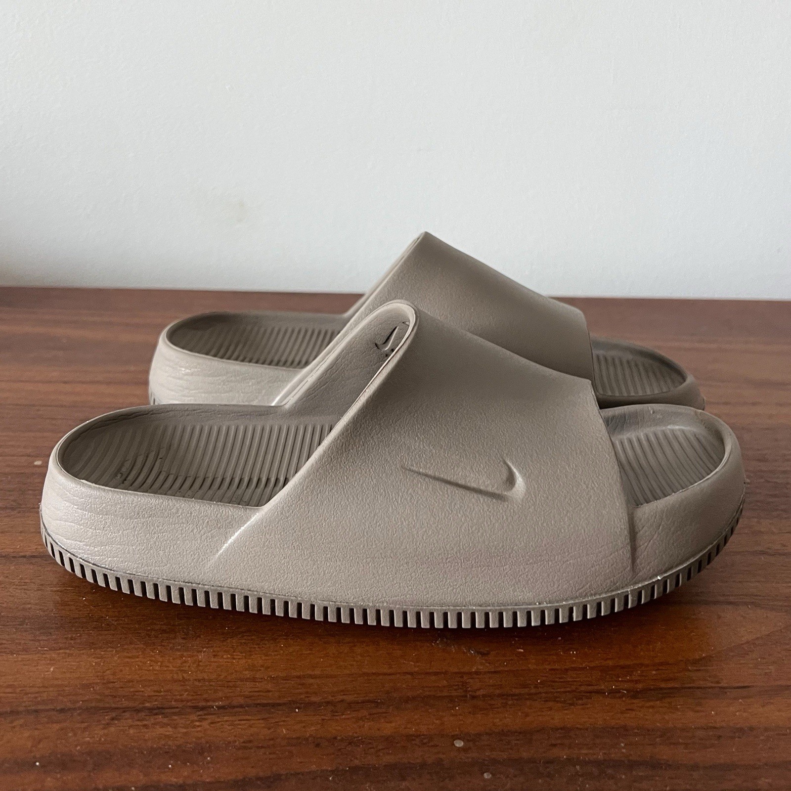 Effortless comfort with a modern, minimalist look. These Nike women’s slide sandals feature a sleek molded design with a cushioned footbed—perfect for everyday wear, lounging, or quick errands. Details: • Brand: Nike • Women’s Size: 7 • Style: Slip-On Slide Sandals • Color: Gray / Stone • Material: Lightweight molded synthetic • Design: One-piece cushioned construction with subtle Nike swoosh • Sole: Textured footbed with grippy outsole Condition: Pre-owned in good condition. Light cosmetic wear from normal use, including minor scuffing and footbed marks. No cracks or structural issues. See photos for full condition details.
