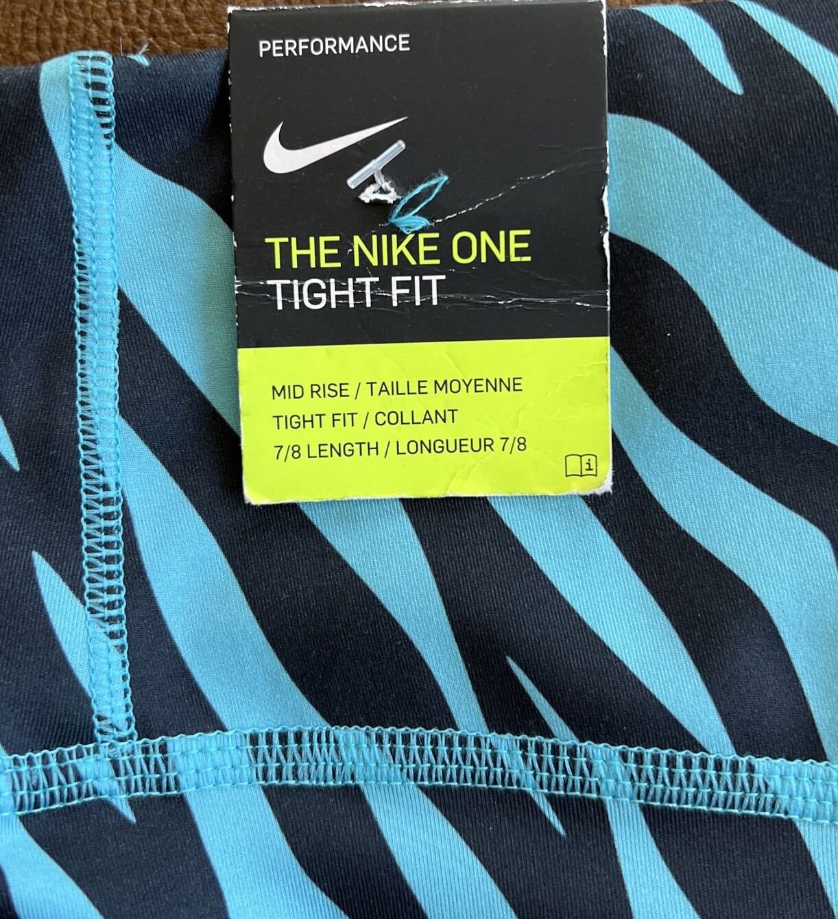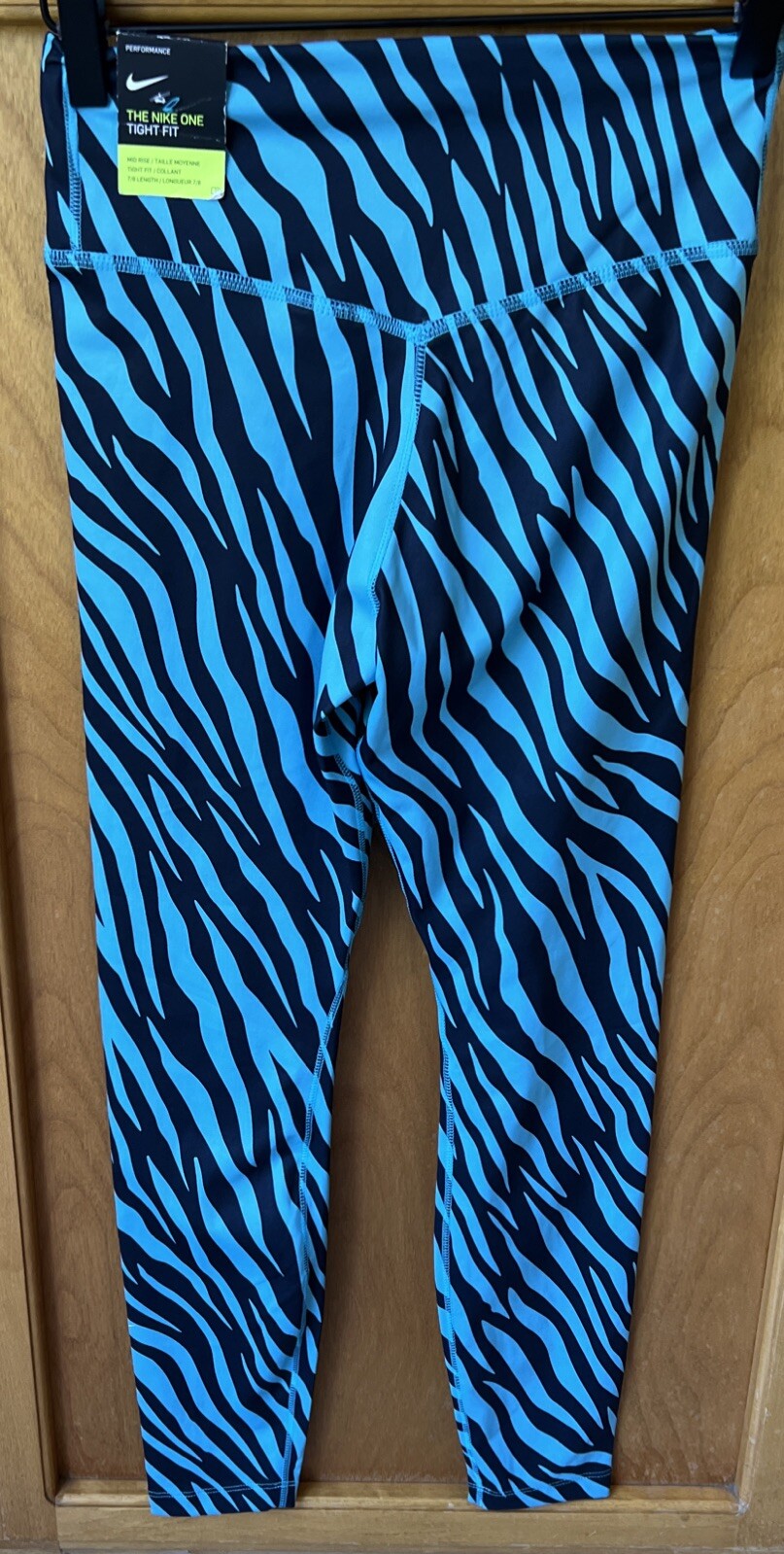Brand new with tags. See photos for the item that will be shipped. THE NIKE ONE Women's Nike Performance Tight Fit Mid rise Legging B lue and Black Tiger Print Size: SMALL 7/8 Length Activewear Sportwear