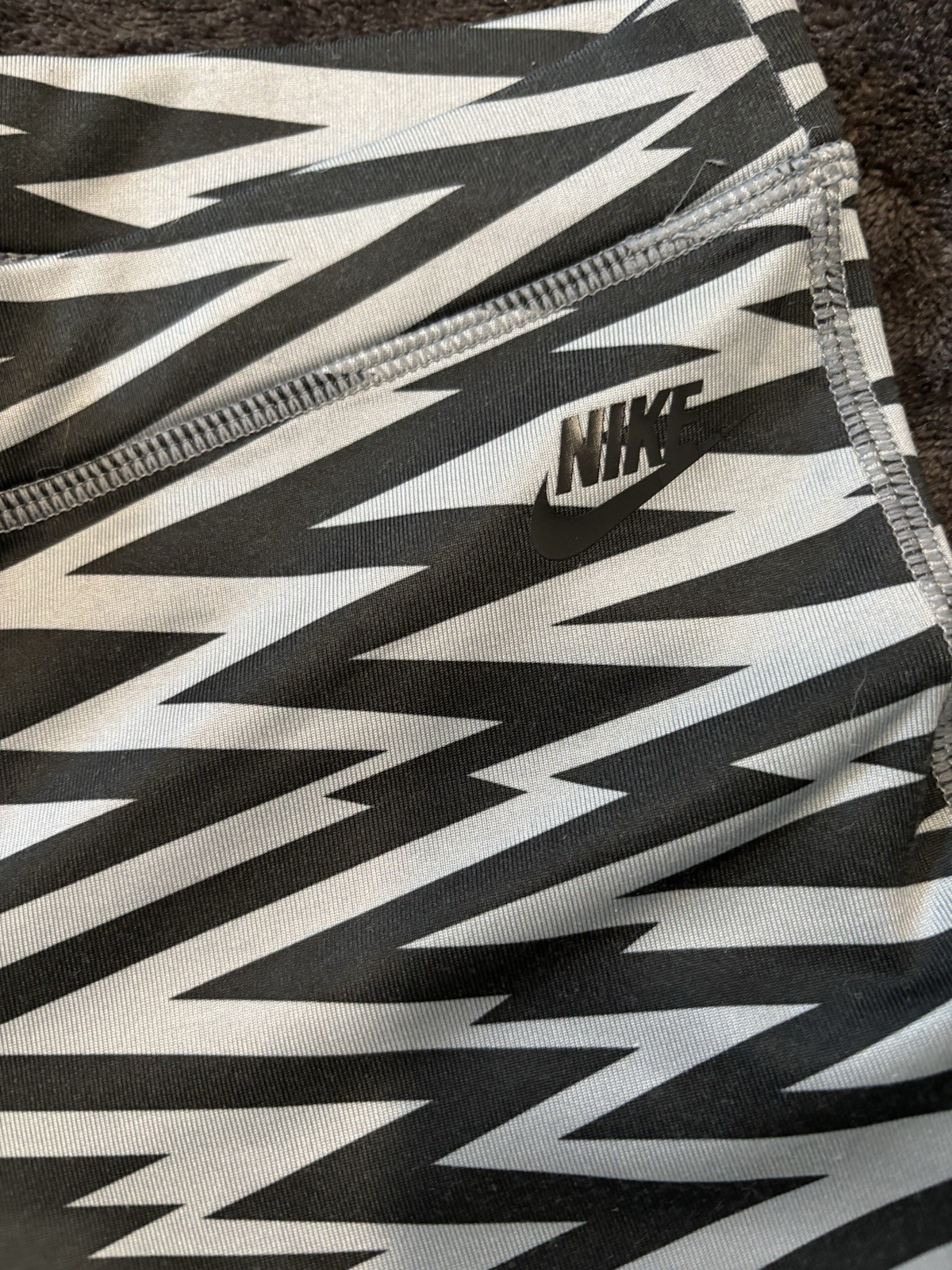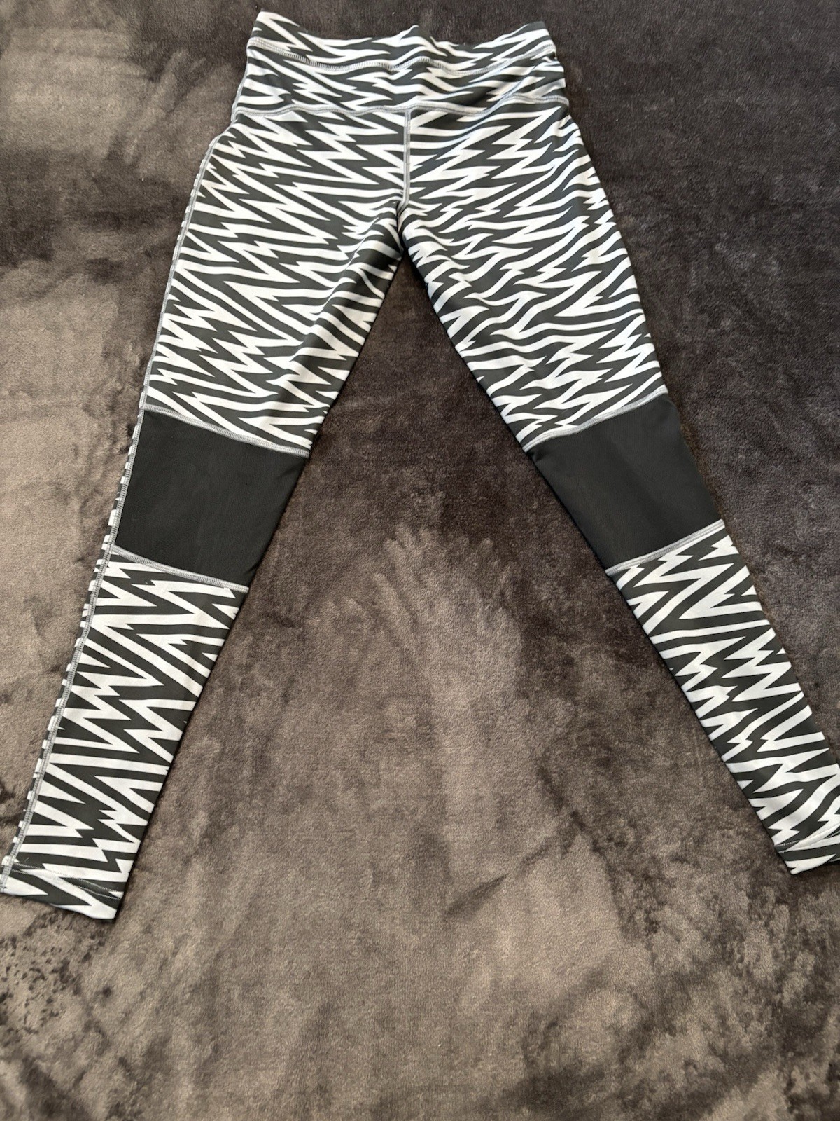 Nike athletic leggings women’s size XS black and gray zig zag pattern with mesh panels on back of legs. Pre-owned in good condition. Inseam 27” waist 26” rise 8”. Athletic, workout, yoga, running, Nike