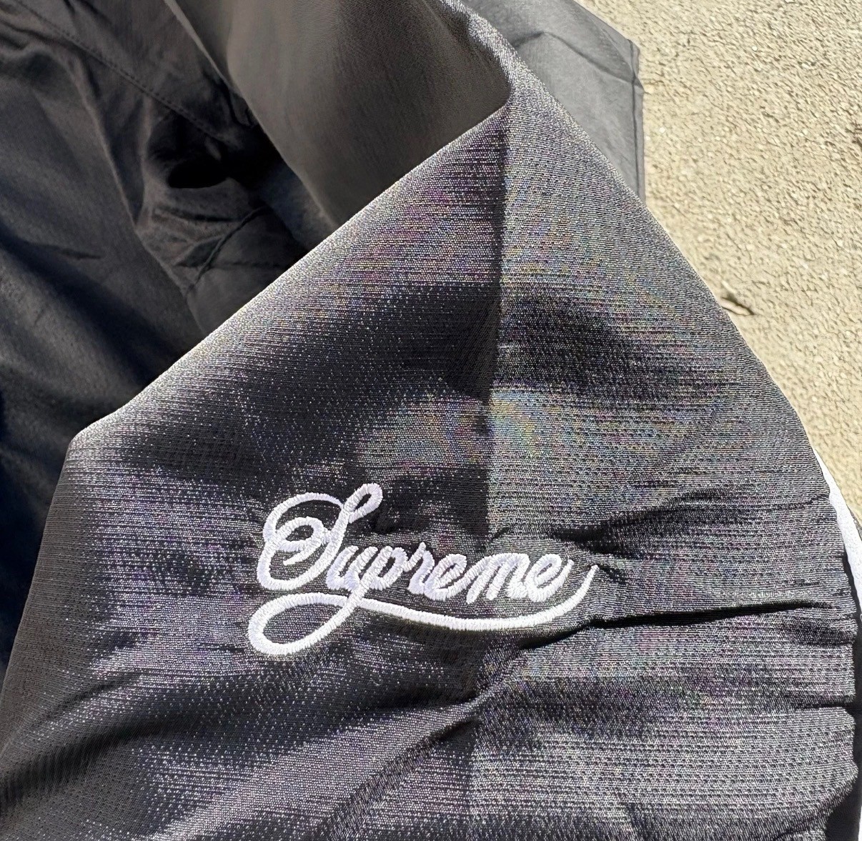 The Nike X Supreme Track Jacket vintage in size small is a stylish and versatile activewear piece perfect for fall. Made with a durable nylon outer shell and featuring a mid-length design with long sleeves, this jacket offers a regular fit for comfort during your workouts. The black color and signature Nike and Supreme branding make this track jacket a standout addition to any man's wardrobe, suitable for machine washing for easy care. Whether you're hitting the gym or running errands, this jacket is sure to keep you looking sharp and staying active.