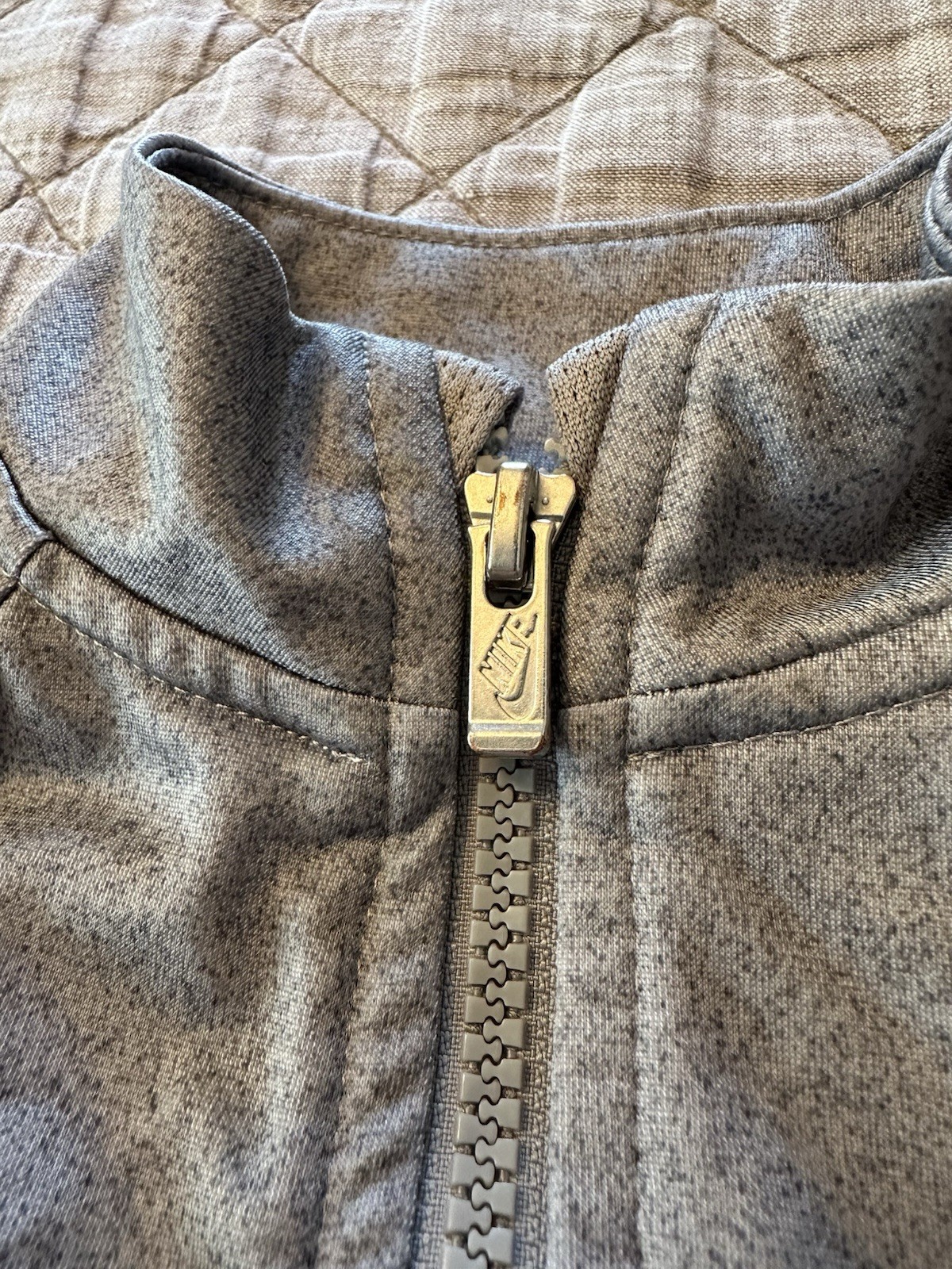 The Nike Youth Boys 4T Gray Full Zip Sweatshirt Track Jacket is a stylish and comfortable outerwear option for young boys. Made from a durable blend of polyester and elastane, this sweatshirt features a solid gray color with sleeve spellout accents and logo taping. The full zip design, crew neck, and long sleeves make it easy to layer over outfits, while the pockets add functionality. Perfect for active kids, this Nike sweatshirt is machine washable and features the iconic Swoosh logo, making it a versatile and trendy addition to any boy's wardrobe.