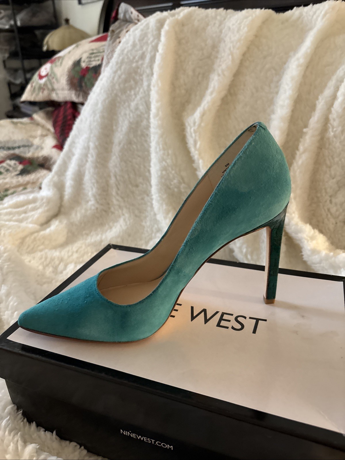 These Nine West turquoise suede stiletto pumps in size 8 are a stunning choice for formal occasions like weddings, parties, or cocktail events. With a pointed toe and ultra high stiletto heel, these slip-on pumps feature a solid blue color with a leather lining and upper material. The pumps are part of the Nine West Tatiana collection and are perfect for those who love a going out, disco, or celebrity-inspired look. These stylish and elegant pumps are a must-have for any fashion-forward woman looking to make a statement at her next special event.