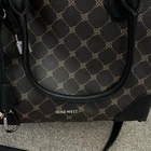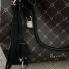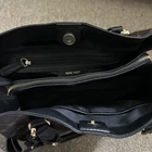 The Nine West Brown Brooklyn Jet Set Satchel is a stylish medium-sized tote bag featuring a brown exterior with black and gold accents. It has a zip closure, double brown handles, and inner pockets for organization. The bag also includes a detachable strap for added versatility. Made from faux leather with a polyester lining, this satchel/top handle bag is part of the designer Nine West Brooklyn collection, perfect for adding a touch of luxury to any outfit.