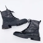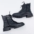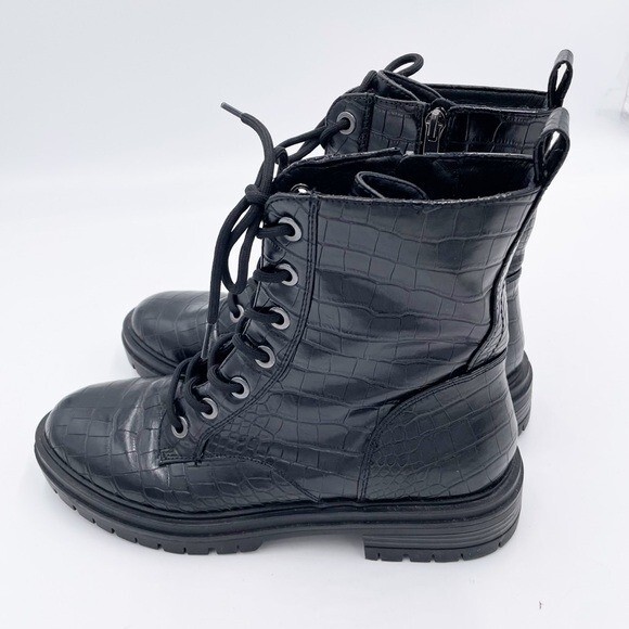 NINE WEST Piercy Black Croc Combat Moto Boots Black crocodile texture combat boots Faux leather Lug sole Lace up front with side zipper closure Rocker, goth, punk, grunge, streetwear style Size 9.5M Very good pre-owned condition Some minor exterior wear - see photos