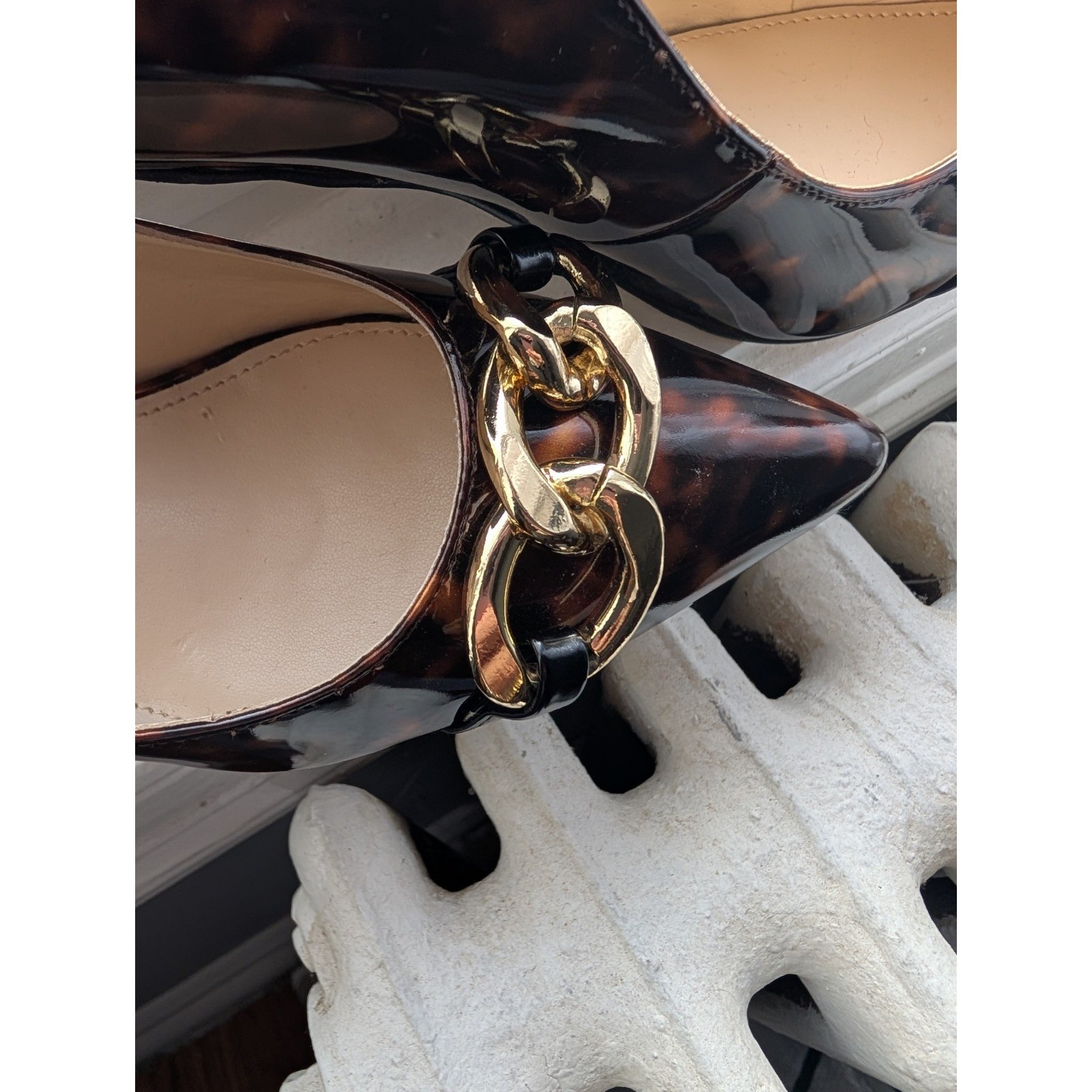 The Nine West Pump in a tortoise color with gold-tone chain detail is a stylish and elegant option for women looking to make a statement at a party or cocktail event. The stiletto heel, pump style, and multicolor design make it a versatile choice for various occasions. With a size 7 fit and synthetic upper material, these heels are both fashionable and comfortable, perfect for the summer, fall, and spring seasons.