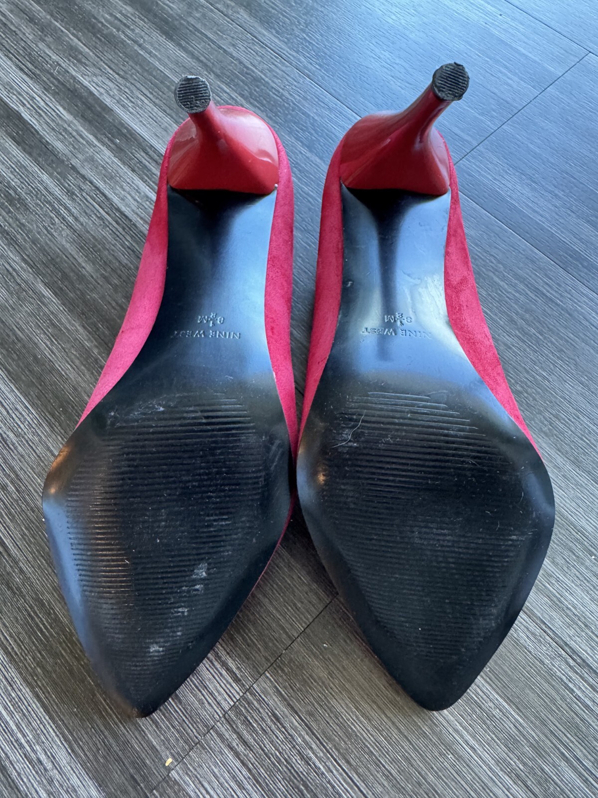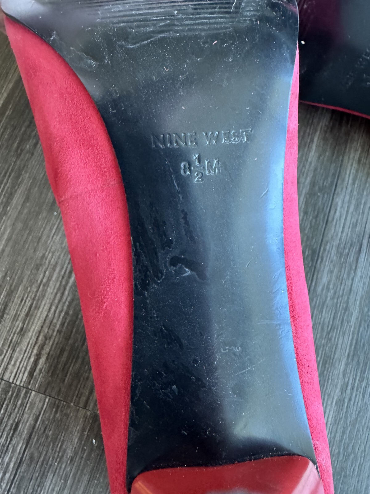 Add a bold pop of color to your wardrobe with these timeless Nine West red suede pointed toe pumps . Elegant, sleek, and versatile—perfect for the office, nights out, or special events. Brand: Nine West Color: Red Material: Suede Toe Shape: Pointed Heel Height: Approx. 3.5 inches Size: Women’s 8.5M Condition: Pre-owned, gently used Chic pointed toe silhouette Comfortable slip-on design Classic pump for everyday elegance Ships fast and safely. Message with any questions!