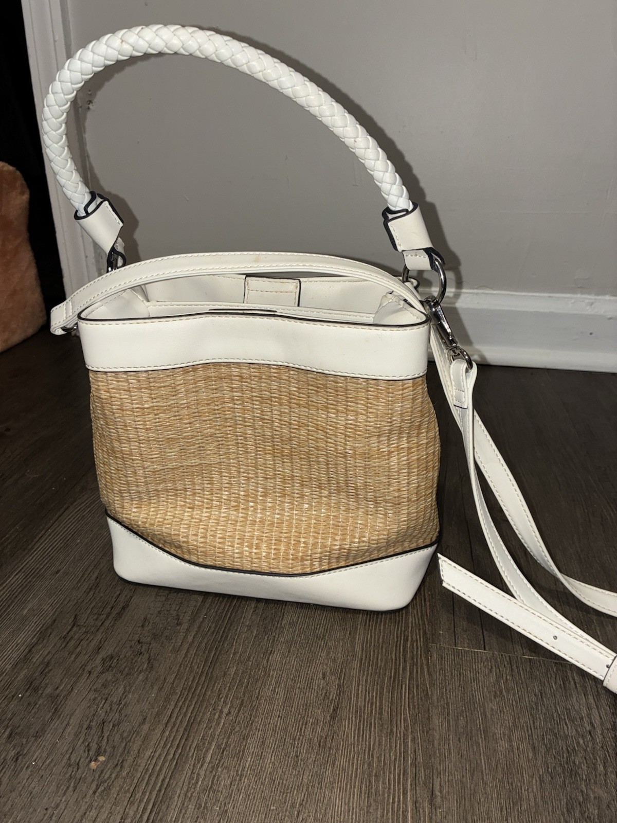 Nine West Straw Bucket Bag White Braided Handle Drawstring Detachable Strap