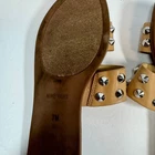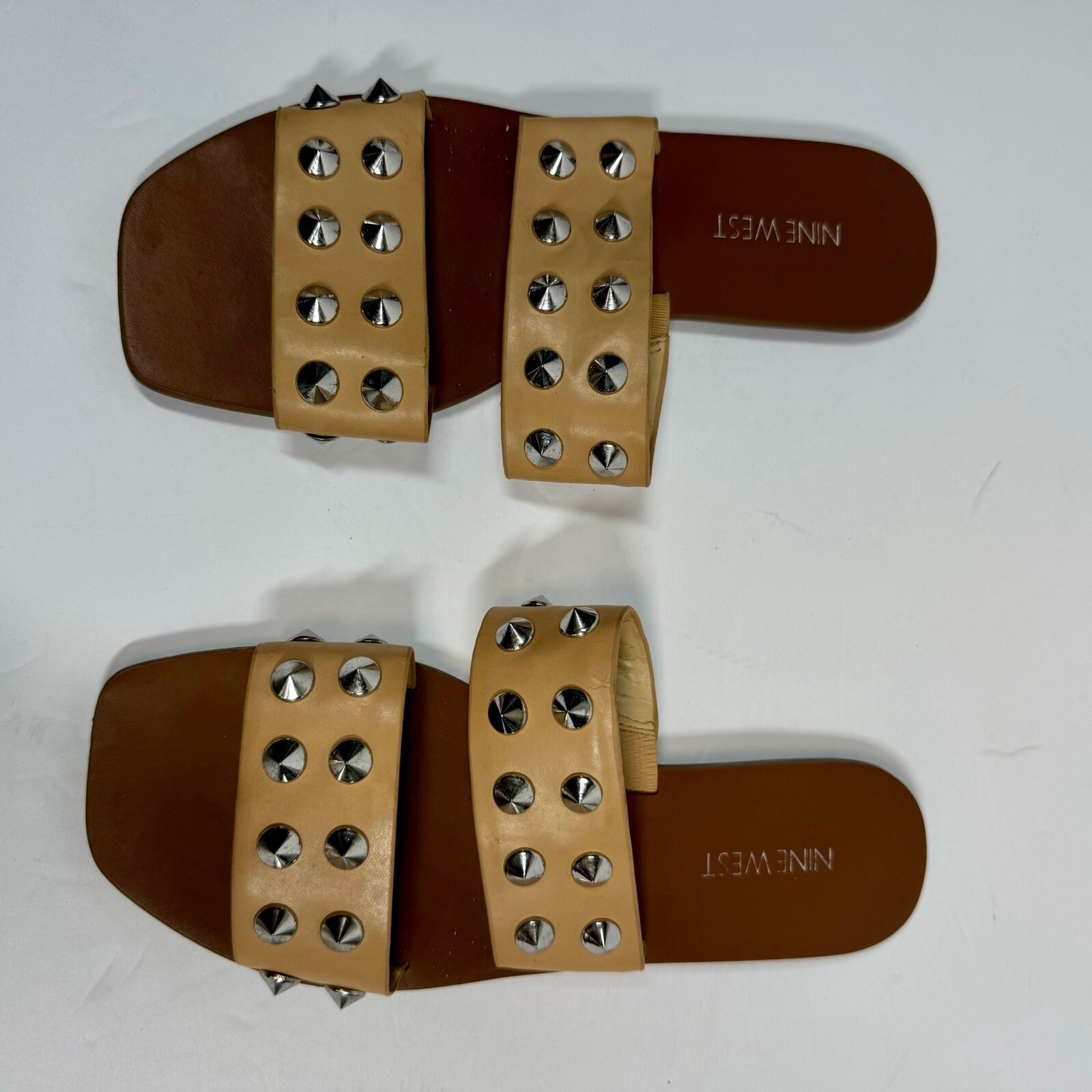 Elevate your warm-weather style with these chic Nine West studded slide sandals. These stylish flats feature a double-strap design adorned with eye-catching silver-tone studs, adding a touch of edgy sophistication to any outfit. The neutral beige straps complement the rich brown footbed, creating a versatile look that pairs effortlessly with a variety of ensembles. Imagine the soft feel of the footbed as you stroll through a sun-drenched market or enjoy a casual brunch with friends. Perfect for adding a touch of flair to your everyday look, these sandals are ideal for weekend getaways, casual outings, or simply relaxing by the pool. Style: Slide Color: Beige Department: Women Upper Material: Faux Leather Heel Style: Flat Features: Studded, Comfort, Cushioned, Lightweight Closure: Slip On Pattern: Solid Model: Nine West Studded Slides Accents: Studded Type: Sandal Heel Height: Flat (Under 1 in) Keywords: Nine West sandals, studded sandals, slide sandals, two strap sandals, flat sandals, casual shoes, women's sandals, beige sandals, brown sandals, size 7M, summer footwear, fashion sandals, stylish sandals, comfortable sandals