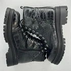 Elevate your style with these Nine West black croc print lace-up combat boots. Featuring a mid-calf shaft style and round toe shape, these boots are designed to provide both comfort and style. The boots are made with synthetic upper material and faux leather lining and outsole material, making them perfect for any season - winter, summer, fall, or spring. These boots have a solid pattern and a block heel style with a mid-heel height of 2-2.9 inches. The boots are branded with Nine West and are available in UK shoe size 4 and US shoe size 6.5. The boots are perfect for any woman who wants to add a touch of combat style to their wardrobe. 100% CUSTOMER SATISFACTION IS OUR GOAL! Our items are always carefully examined for condition, measured if necessary, and photographed in a climate controlled and smoke-free environment. We make every attempt to accurately describe and clearly picture the items we have for sale. Please, ALWAYS view all of the photos. We value your business and our goal is your complete satisfaction. FAST SHIPPING All items are packaged with care and shipped out the same or next business day via USPS, FEDEX, or UPS with tracking numbers so you are always informed. RETURNS We offer a 30-day return policy. All items must be unused and unopened in the condition in which they were received, with original packaging, and all accessories included for return. REVIEWS - CUSTOMER SATISFACTION - COMMUNICATION We aim to make you happy. After you receive your shipment, please leave a positive review . If you have concerns or questions about your order, please contact us so we can resolve the issue. We will do our best to make you satisfied. THANK YOU FOR YOUR BUSINESS!
