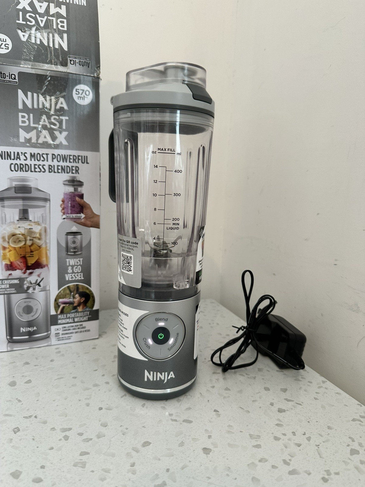 Used but in very good working condition ! Ninja’s most powerful cordless blender: Sharp blades blast through ice & tough ingredients in seconds Long-lasting battery life: Blend on-the-go with up to 25 blends per full charge 3x blending functions: Automatic Crush & Smoothie programmes, plus Manual Blend mode Removable Twist & Go cup: Light & portable blending with leak-proof sip lid & carry handle. Powerful 11.1 volt battery Includes: Ninja Blast motor base, 570ml** Twist & Go cup with built-in CrushBlade, leak-proof lid, charging cable & Recipe Guide. Dimensions: H: 30 x W: 9 x D: 11.5 cm. Weight: 1.3kg. Colour: Cool Grey.