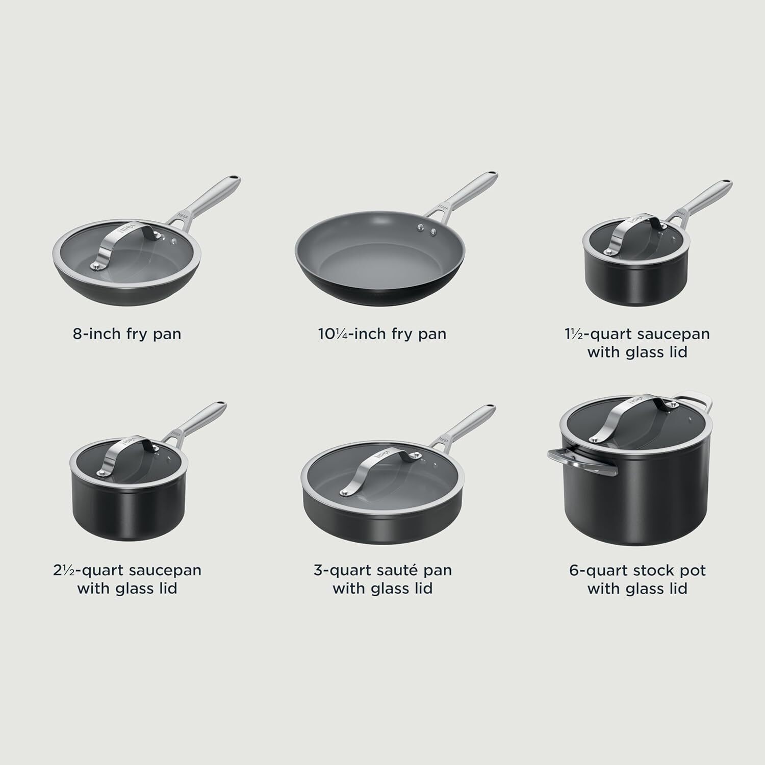 LONG-LASTING NONSTICK PERFORMANCE: Exclusive Titanium-infused ceramic coating. 10-year nonstick guarantee. 3x more scrub resistant* to withstand harsh brushes and sponges *vs Caraway ceramic coated cookware. NONTOXIC COATING: Designed without lead, cadmium, and PFAS chemicals PFOA and PTFE. PREMIUM SEARING: Sears like HexClad for unmatched searing performance. VIRTUALLY INDESTRUCTABLE: Metal utensil safe, and warp and stain resistant. 5x more scratch resistant* to handle any utensil use *vs Caraway ceramic coated cookware. NO HOT SPOTS: 4mm thick heavy gauge aluminum base for even heat distribution. SLEEK LID DESIGN: Flat, fitted tempered glass lids ensure convenient storage and maximum visibility while cooking. BUILT FOR VERSATILITY: Pots and pans are broil-capable to 550°F and dishwasher safe. ALL RANGE-CAPABLE: Compatible with gas, electric, glass ceramic, and induction stovetops. 10-YEAR GUARANTEE: Cooking surface with trusted durability backed by Ninja’s 10 year guarantee when used as directed*. What's in the box: 8" Fry Pan with Lid, 10.25" Fry Pan, 1.5qt Saucepan with Lid, 2.5qt Saucepan with Lid, 3qt Sauté Pan with Lid, 6qt Stock Pot with Lid and User/Recipe Guide. Contact Us: We can be contacted at any time through eBay messages if you have any questions, comments or product requests. We will respond to you within 24 hours and do our best to help you out! We encourage our customers to contact us with any questions or concerns! We'd like to be sure you are completely satisfied with your purchase. Payment: We offer FREE shipping on all orders! Please allow 4-7 business days for the package to arrive, We use a selection of shipping services such as UPS, FedEx, USPS etc. We only ship to the lower 48 states, no APO/FPO addresses or PO Boxes allowed. We will provide an online tracking number to you once the item has been shipped. It may take a few business days for our automated system to process the tracking number onto eBay. However, this will not affect the shipping times. Disclaimer: We take our reputation seriously. If you have any questions or concerns, please contact us and we will respond back to your message within 24 hours. Thank you for your interest in our listings!