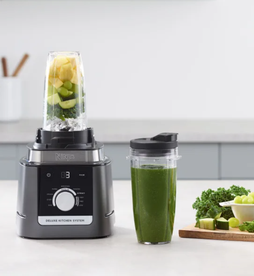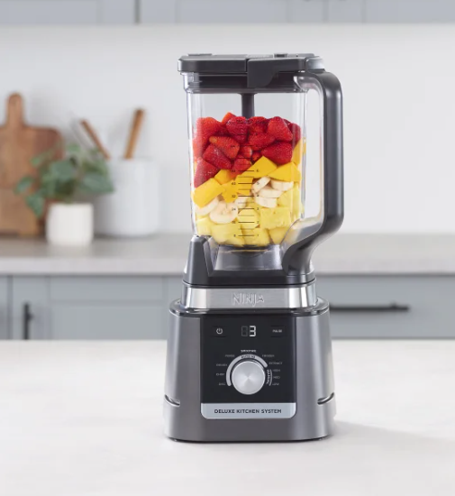 Ninja Deluxe Kitchen System with 88-oz. Pitcher, 9-Cup Processor, & Auto-iQ Total Crushing blades transform ice to snow and crush frozen fruit for evenly blended smoothies, shakes, and resort-style frozen drinks. Chop, puree, and mix up to 2.5 lbs. of dough in the food processing bowl. With the reversible slicing/shredding and grating discs, you can slice cucumbers, shred carrots and cabbage for coleslaw, grate cheese, and much more. Blend directly in the 24-oz. single-serve cups for healthy nutrient extractions*, smoothies, and frozen drinks. Use the spout lids for easy drinking on the go. *Extract a drink containing vitamins and nutrients from fruits and vegetables. About this Item Ninja's Largest Kitchen System with 20% More Blending Capacity 7 Preset Auto-iQ® Programs Make Blending and Food Processing Easy 1600-peak-watt Motor Base Crushes Ice to Snow Mix Up to 2.5lbs of Dough in the 9-cup Deluxe Food Processor Low, Medium, and High Speeds Give Control of Your Blend Buy with confidence, Order yours today!