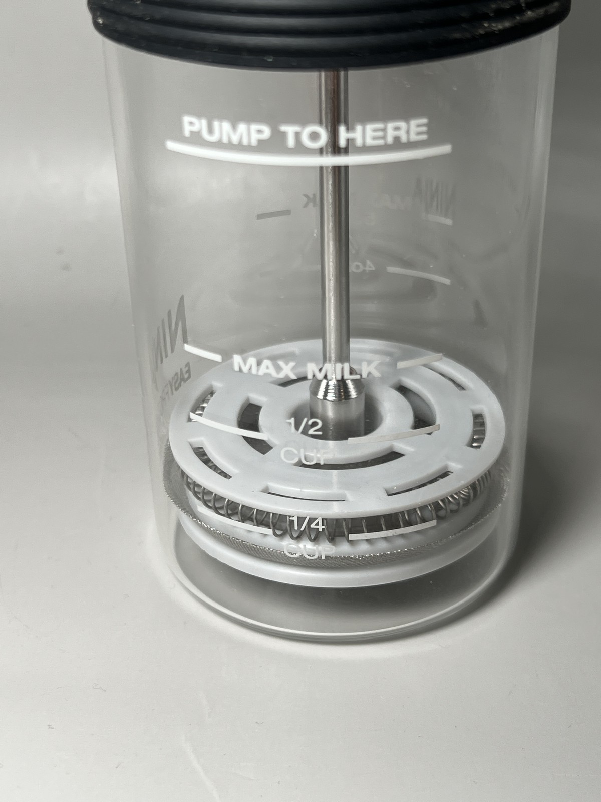 Ninja Easy Frother Glass Milk Frother Hand Pump Manual Black Lid Coffee Latte Barista Condition: New Clear glass body with measurement markings for 1/4 cup, 1/2 cup, and max milk fill line Pump-action frother with stainless steel handle and black plastic lid Wide ribbed black silicone grip for comfortable handling while frothing Visible "Ninja Easy Frother" branding on the glass Strainer built into the pour spout for smooth pouring Suitable for frothing milk for lattes, cappuccinos, hot cocoa, and coffee drinks Approximate height: about 7.5 inches (see photo with ruler for scale) Perfect for home barista setups or as a replacement part for compatible Ninja systems Came with a coffee bar. Never used